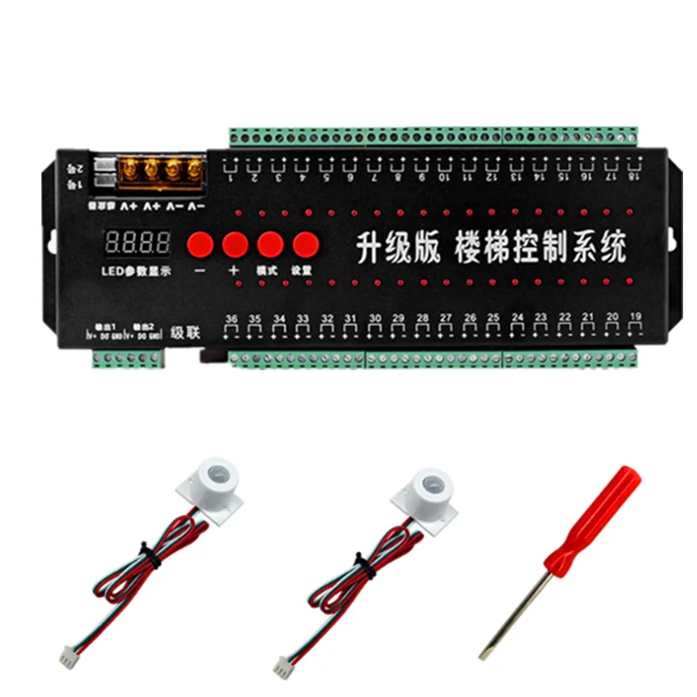 36 канальная Многофункциональный светодиодный лестница контроллер с двумя датчики, который может управлять 2 виды светодиодный полоски, одна полоса, которая поддерживает Однолинейный чип через SPI, например, общего назначения 1903, 1812, 16703 WS2811 и других полноцветных пикселей светодиодный свет, система управления находится в левом нижнем углу D01, GND, DO2 и GND имеют два параллельных выхода клеммы, которые могут быть подключены к левой и правой сторонах лестничного светильник. Выходные клеммы с обеих сторон контроллера-36 монохроматических лент-светильник, количество полос-светильник регулируется, Функция настройки сенсорного контроллера выбирается кнопкой, И установки показана left 4-разрядный цифровой светодиодной лампой.