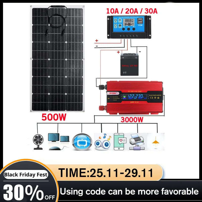 Комплект солнечных панелей ETFE, 1000 Вт, 500 Вт, домашняя система, инвертор, полный комплект, зарядное устройство для солнечных батарей для автомобиля, RV, яхты, кемпинга