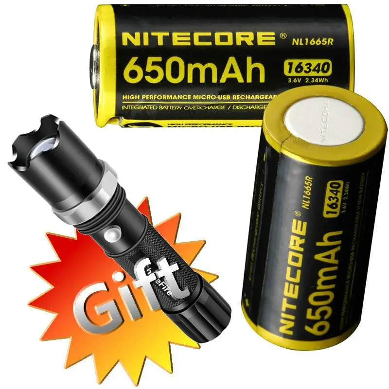 NITECORE NL1665R 650mAh 16340 CR123 высокопроизводительный литий-ионный аккумулятор Micro-USB x2 шт + Бесплатный подарок фонарик