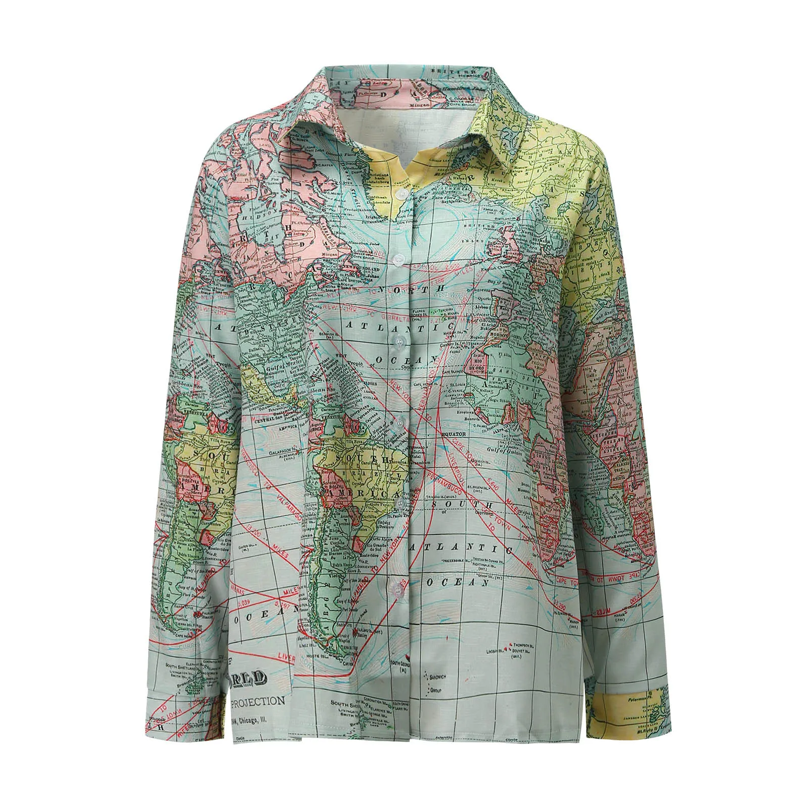 Женская рубашка на пуговицах с отложным воротником, Свободный Повседневный топ с длинными рукавами и принтом карты мира