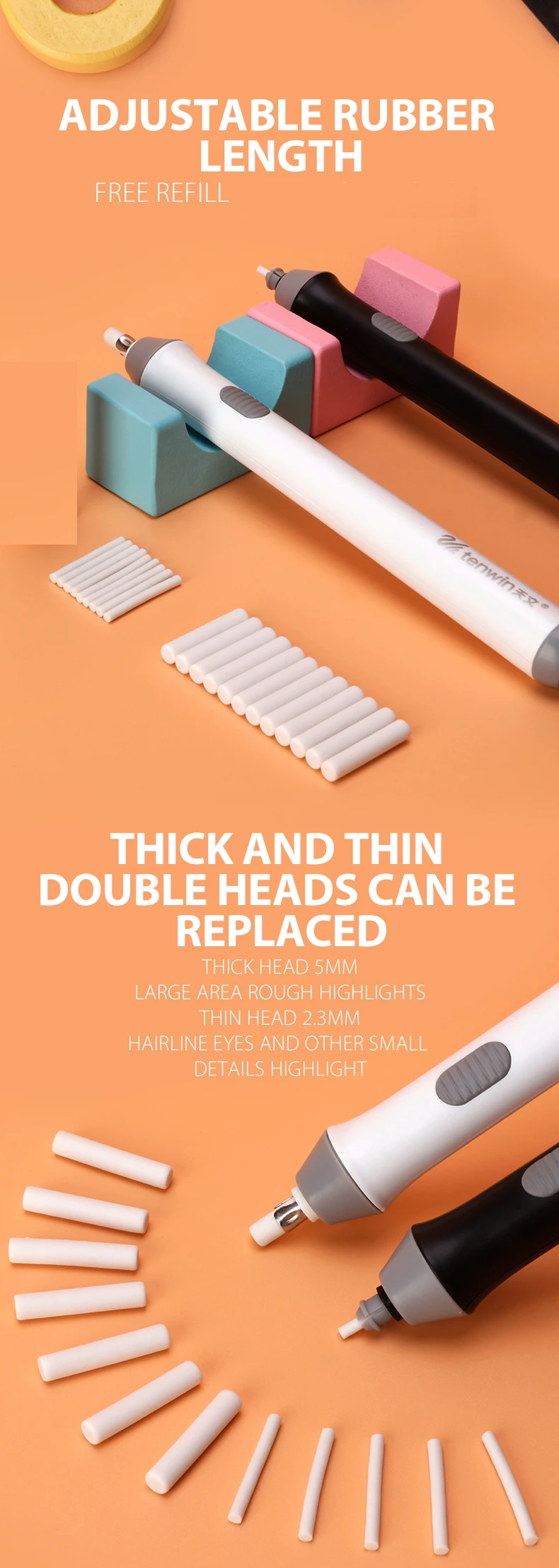 【Новейший дизайн с 2 слотами ластика 】наш Электрический ластик включает в себя 2 держателя ластика для удержания оба φ 2,3 мм и φ 5 мм ластики. Используйте большую, чтобы создать густые блики, а меньшую, чтобы стереть крошечные части, такие как волосы. Идеально подходит для художников и профессионалов.