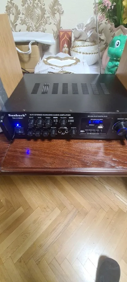 усилок супер.не hi-fi конечно.но за свои деньги отлично.качает s-90 хорошо.доставка до самары 21 день.доставили до двери,проверил все рабочее.флешка читает только fat32.муз,читает в папках,пульт работает только при флешки и радио,микр отлично,минус сильно шумит вентилятор,буду менять,можно брать,