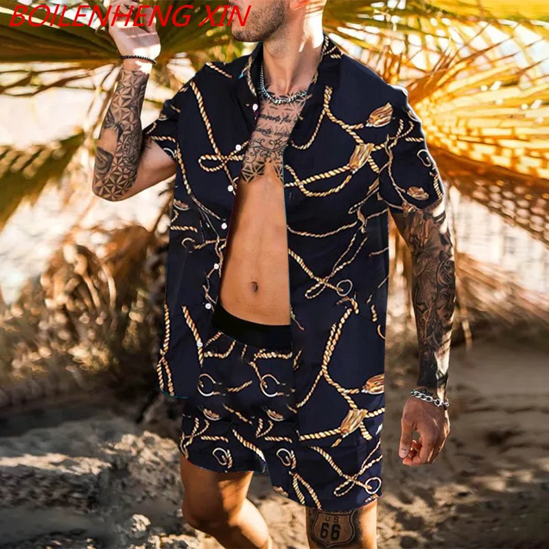 Новинка мужской комплект рубашки с лацканами и короткими рукавами с гавайским принтом Лето 2021 мужские повседневные пляжные быстросохнущие шорты Комплект из двух предметов