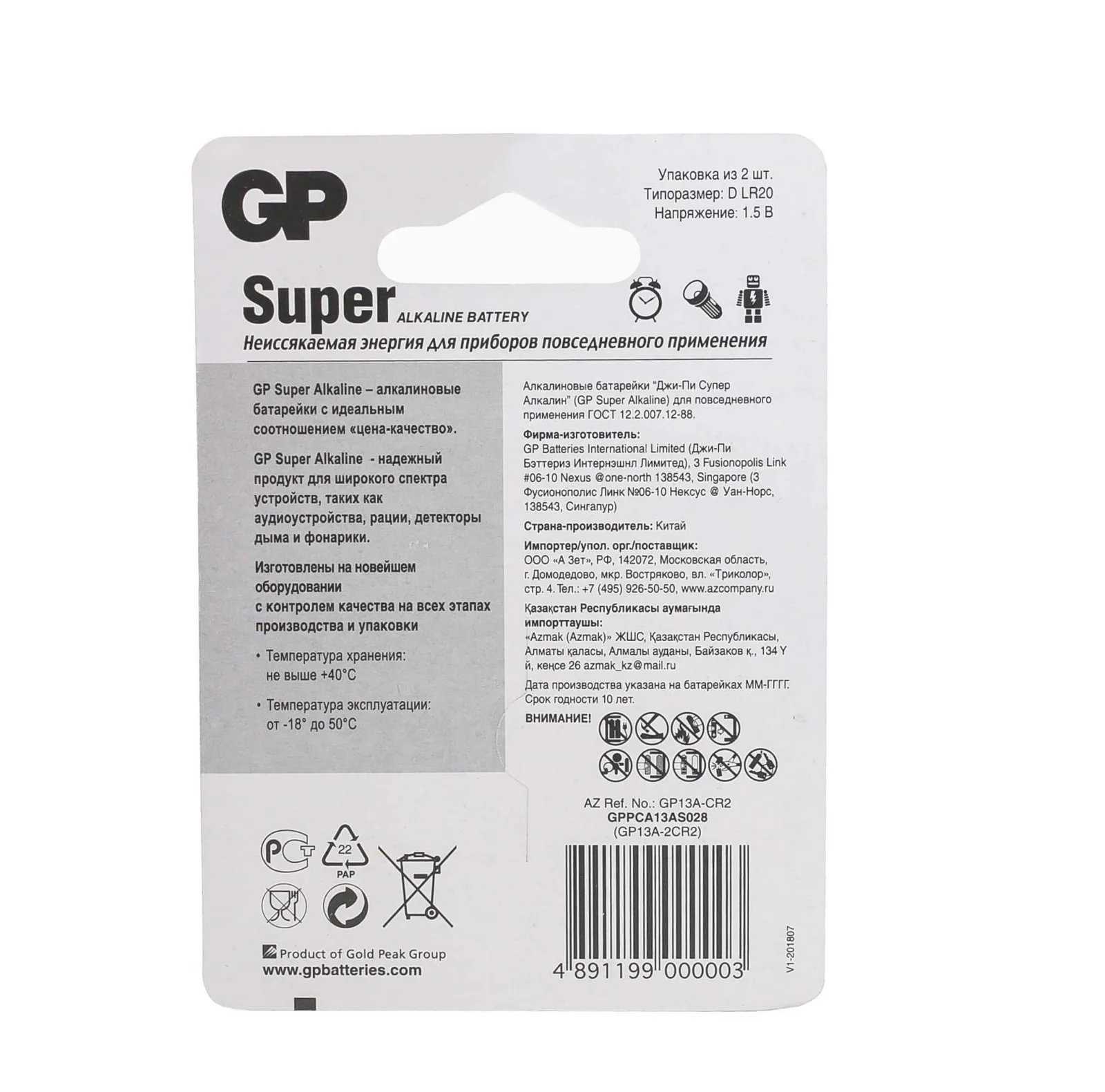 Батарейка D LR20 2 шт GP 13A-2CR2 - серия мощных батареек Super Alkaline разработана компанией GP специально для приборов с повышенным энергопотреблением. Эти батарейки отлично подходят для детских игрушек, часов, игровых консолей, фонарей, портативных радиоцентров и множества других устройств.