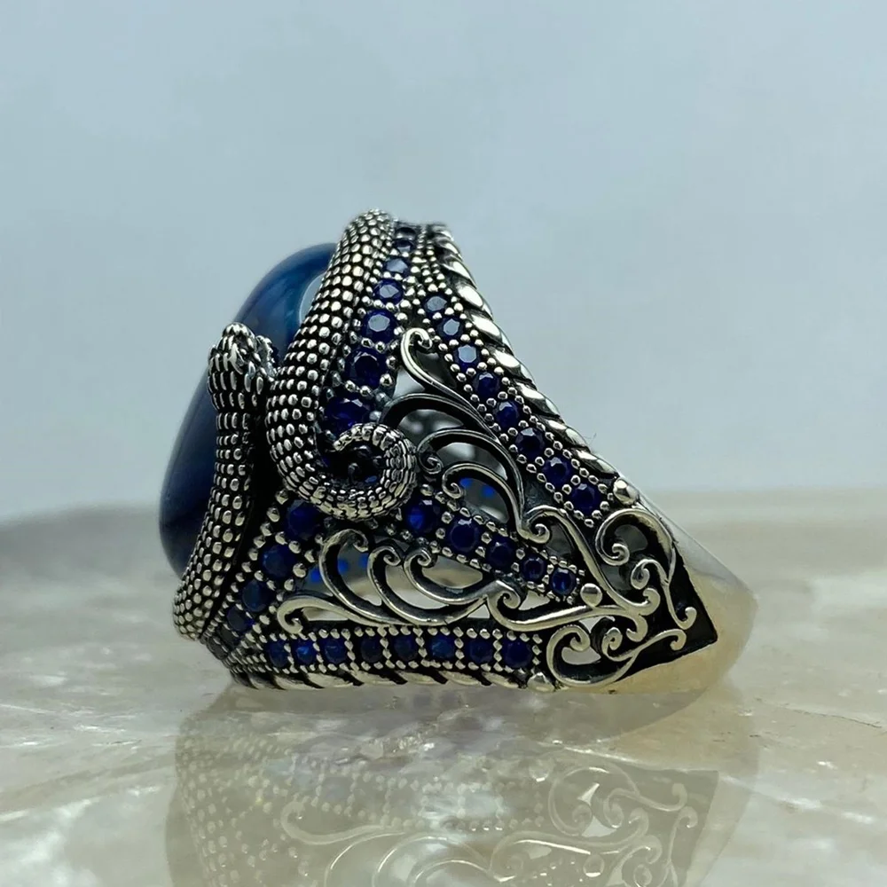 Мужское кольцо ручной работы из серебра 925 пробы с синим сапфиром