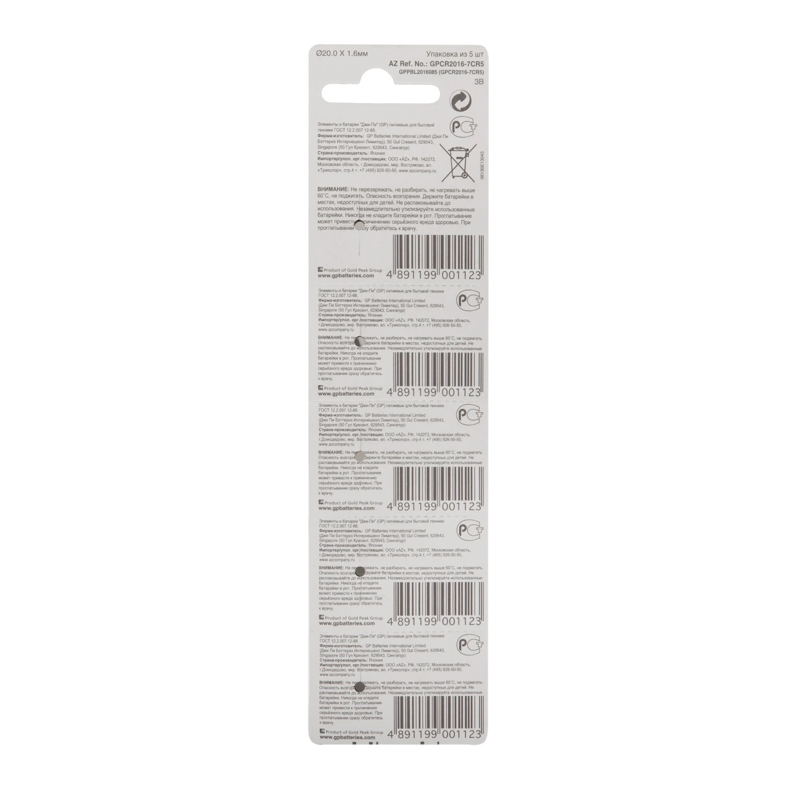 Батареи CR2016-CR1 произведены с учетом международных природоохранных норм; не содержат свинца и ртути и при соблюдении рекомендаций производителя не причиняют вреда окружающей среде и здоровью человека. Батарейки не следует разбирать или деформировать, а элемент с поврежденным корпусом нужно немедленно заменить.