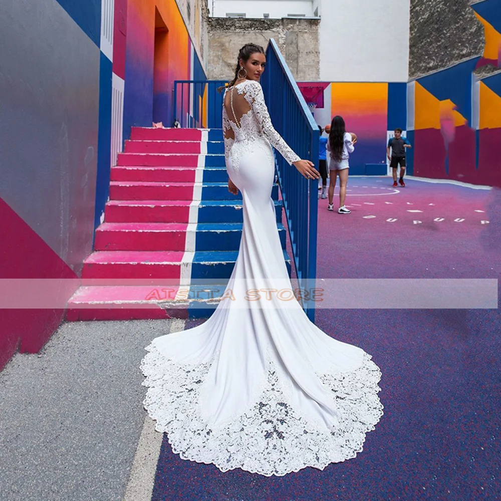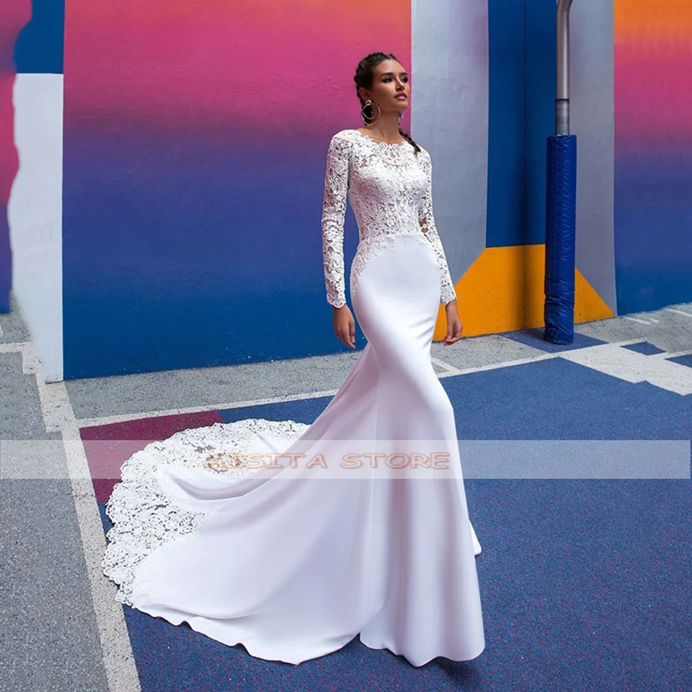 Женское свадебное платье с юбкой-годе, простое длинное кружевное платье с рукавами-аппликациями, круглым вырезом, пуговицами и открытой спиной, со шлейфом, 2021