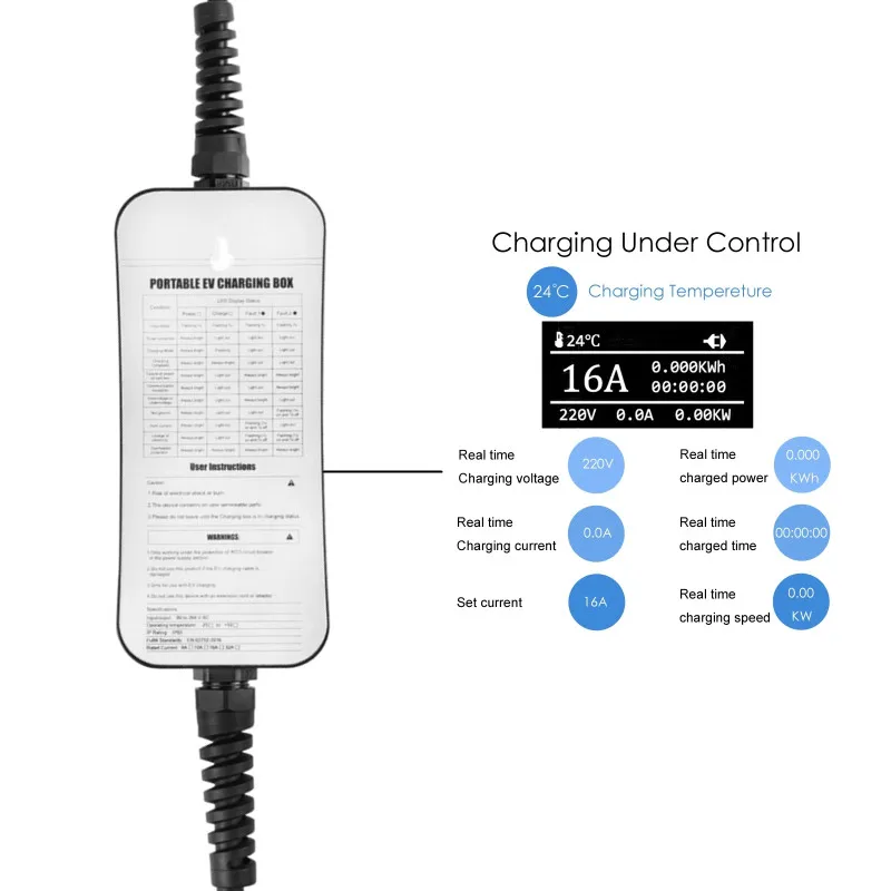 Пуговица круглой формы «А» предназначена для регулировки тока. Слегка коснитесь кнопки, чтобы изменить ток. Когда вы регулируете ток, штепсельная Вилка питания должна быть всегда подключена, штепсельная вилка type1 (SAE J1772) должна быть отключена. Когда вы достигнете нужного тока, подключите его и начните зарядку.