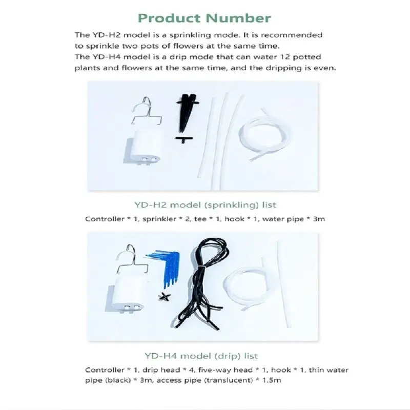 Контроллер * 1, капельная головка * 4, пятиходовая головка * 1, крючок * 1, тонкая водопроводная труба (черная) *, труба доступа (полупрозрачная) * 1,5 м