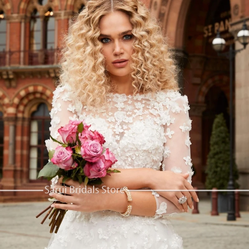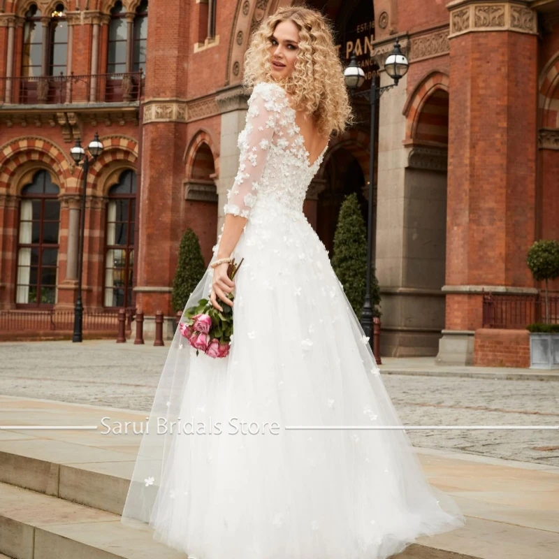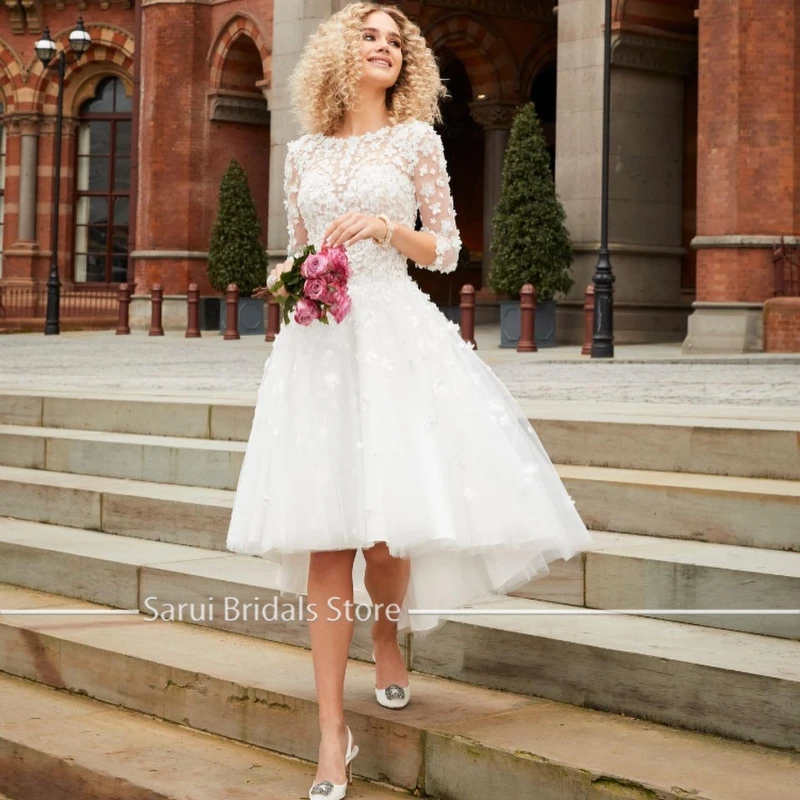 Новинка, свадебные платья с глубоким круглым вырезом, рукавом 34, белые свадебные платья ручной работы с цветочным 3D тюлем, короткие, спереди, длинные, сзади, кружевные
