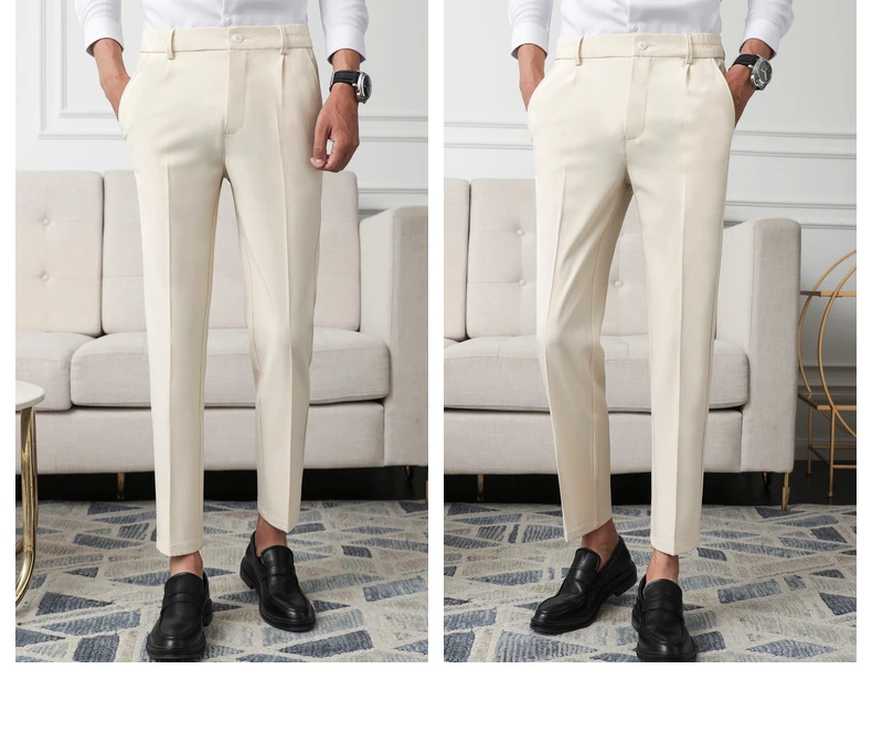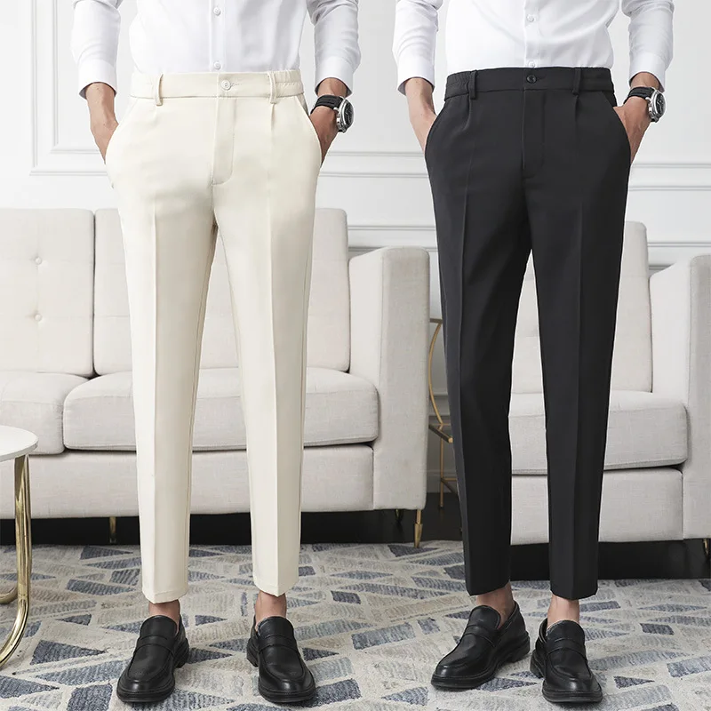 Мужские деловые брюки до щиколотки, бежевые, черные, облегающие, для офиса, не требует глажки, Лето корейские повседневные штаны