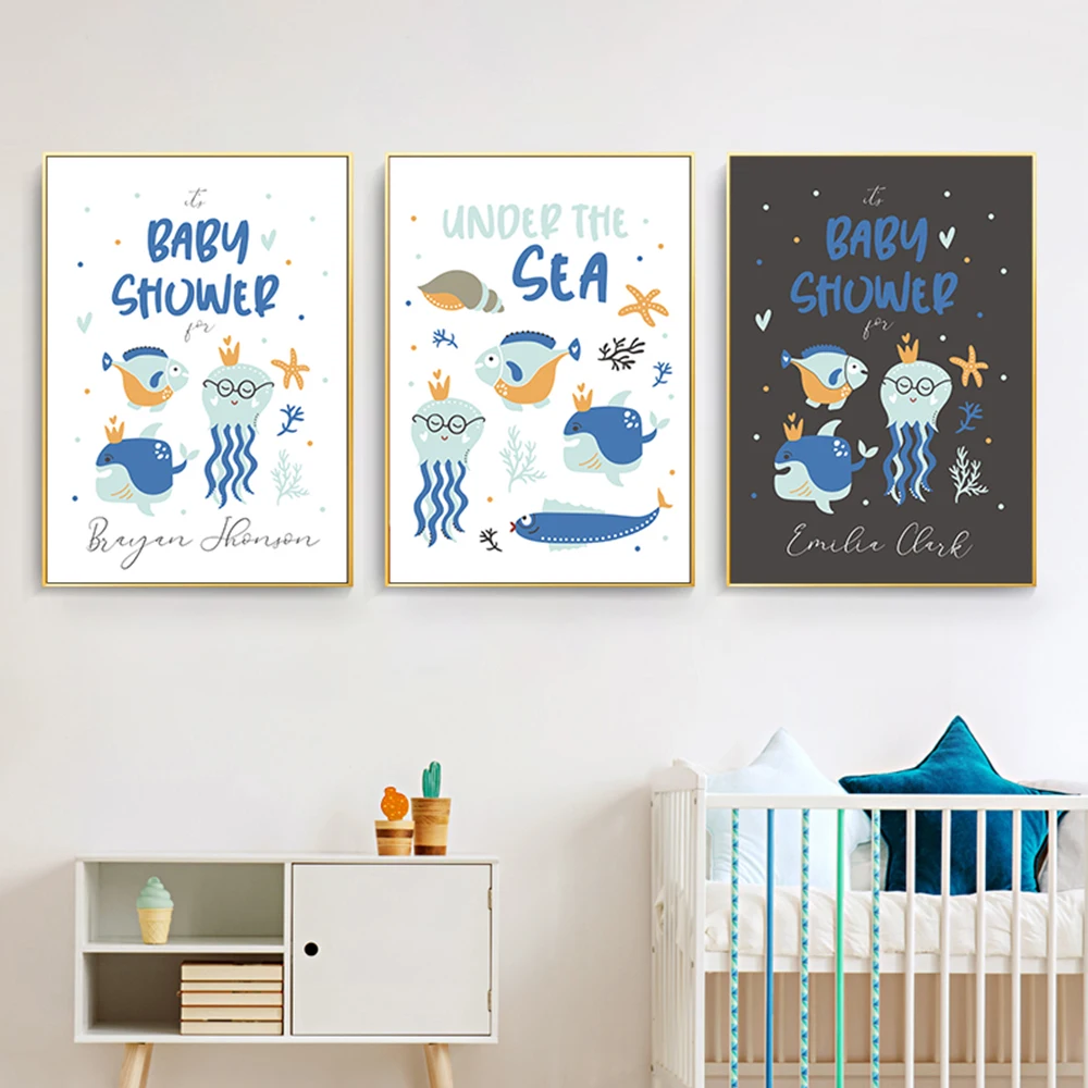 Скандинавская Милая мультяшная синяя морская стена, Картина на холс...