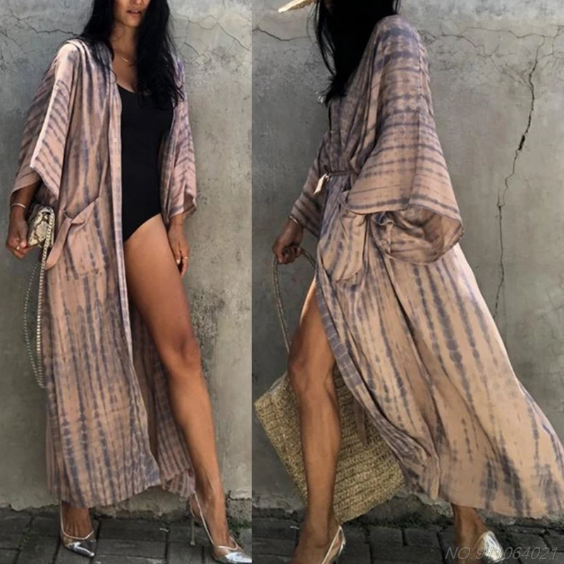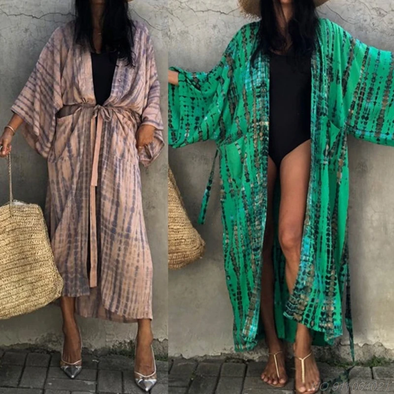 Женское кимоно в полоску, Солнцезащитный Кардиган с длинным рукавом и поясом