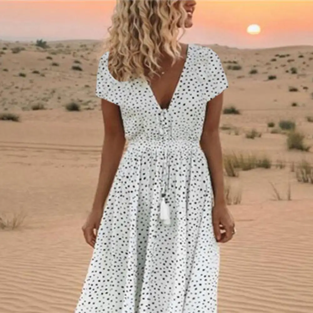 Женское элегантное платье Бохо С V-образным вырезом, весеннее длинное праздничное платье в горошек, макси-платье с кисточками, летние пляжные платья с коротким рукавом, 2021