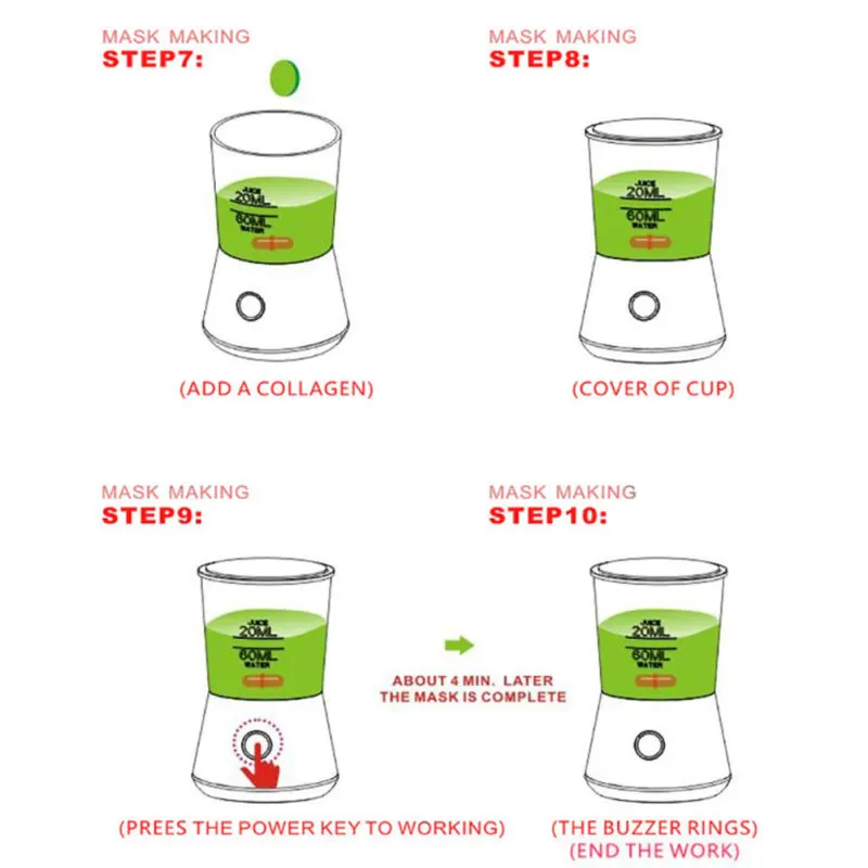1. Залейте 60 мл кипятка при температуре 85 градусов Цельсия2. Добавьте 20 мл сока, молока, красного вина или другого (согласно вашим предпочтениям)3. Положите в зерно коллагена4. Включите переключатель, чтобы автоматически сделать крышку лица5. Через 3 минуты выключите выключатель и вылейте его в лоток для крышки. После охлаждения аккуратно удерживайте его руками. Успешно сделан натуральный чехол.Крышка соответствует форме лица человека, блестит вашу кожу, не беспокоясь о боковом эффекте, просто наслаждайтесь естественным покрытием и массажем кожи.