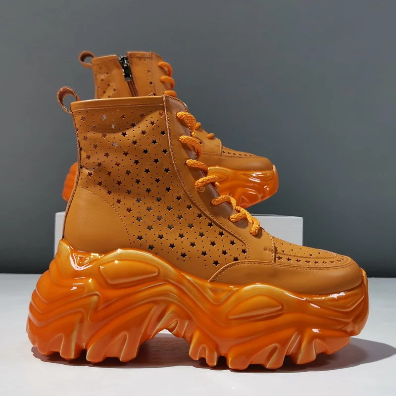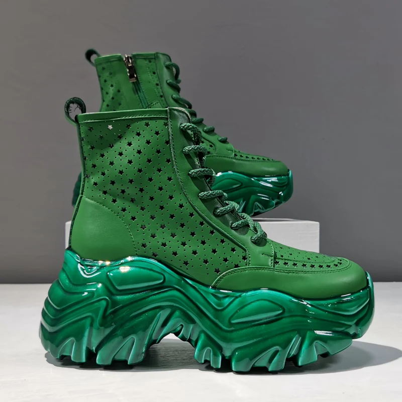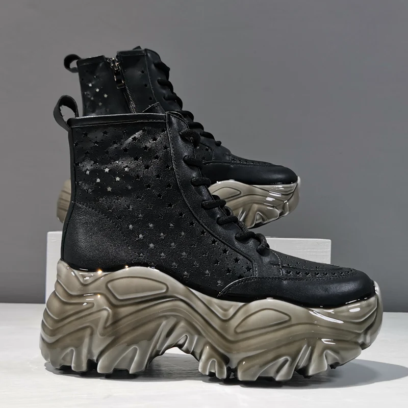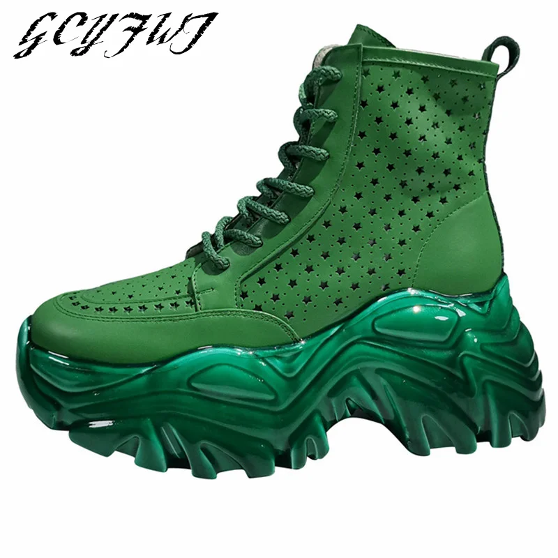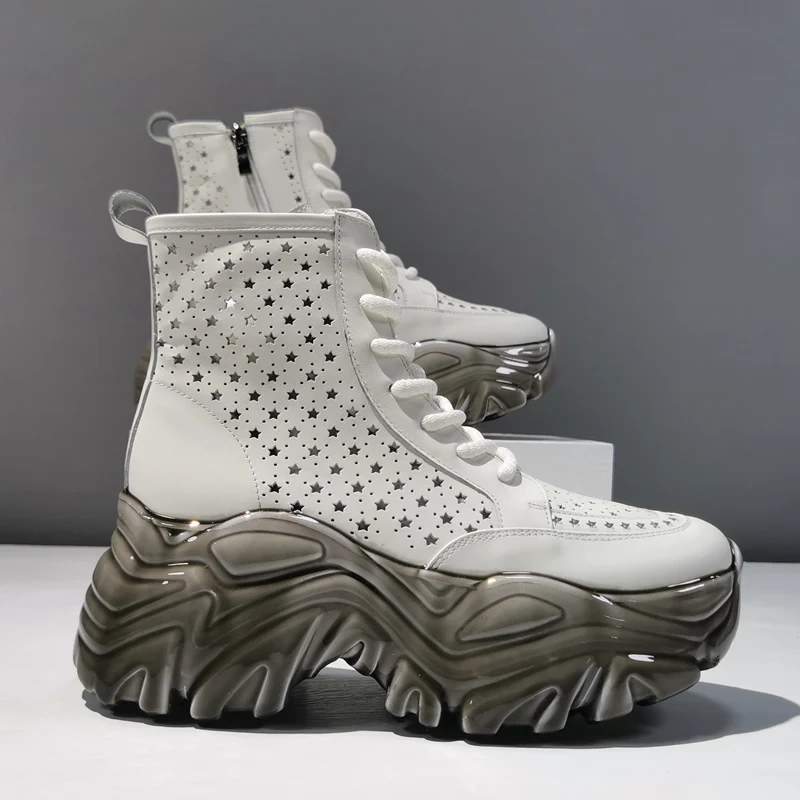 Женские ботильоны, кожаные дышащие ботинки с вырезами, повседневные женские ботинки с высоким верхом, женские ботинки на шнуровке с молнией и толстой подошвой