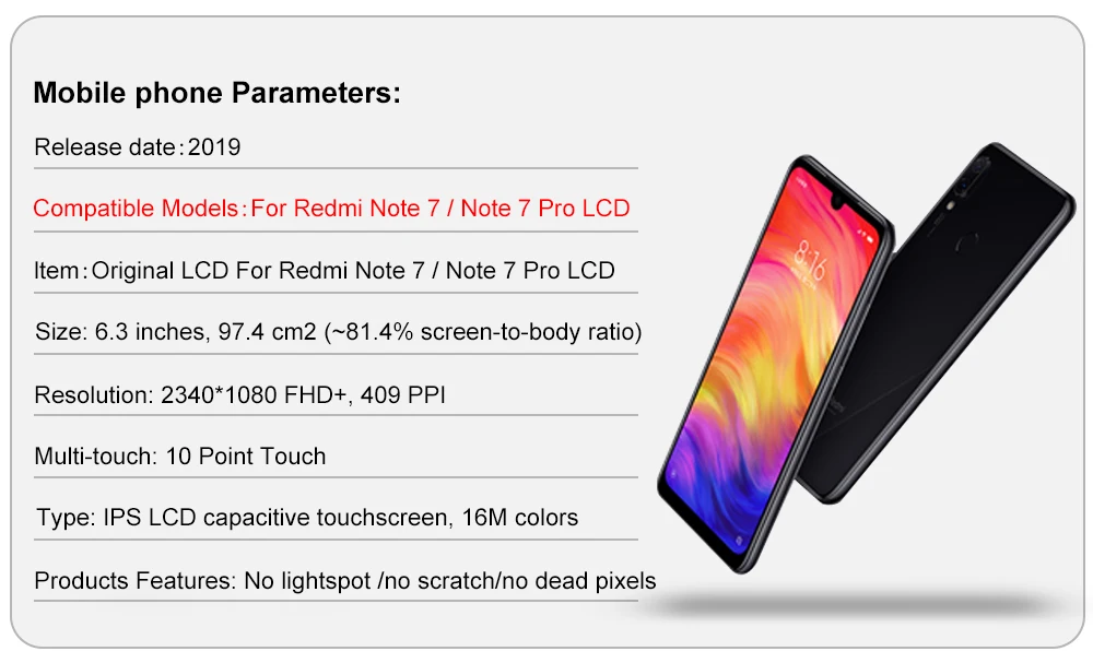 * Оригинальный тест машины, высококачественный ЖК-дисплей.* Подходит для: Xiaomi Redmi Note7 / Note7 Pro* Посылка: 1 шт. ЖК-дисплея + 1 набор инструментов (подарок) + 1 шт. клея (подарок).* Цвет экрана: черный* Цвет оправы: черный, красный, синий* Вариант: без рамки/с рамкой.* Быстрая доставка: Доставка 24 часа.