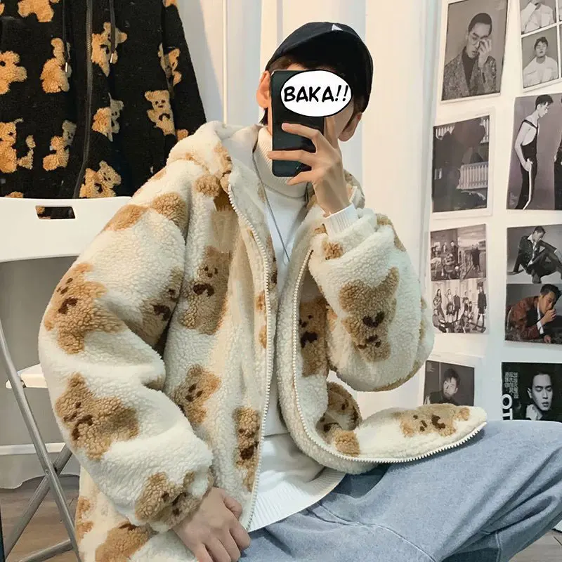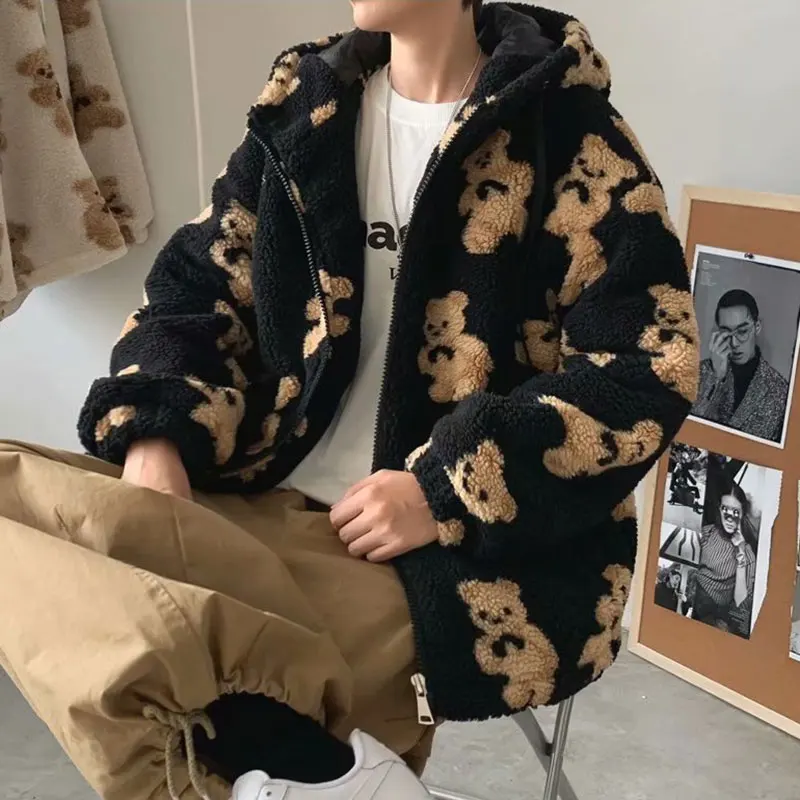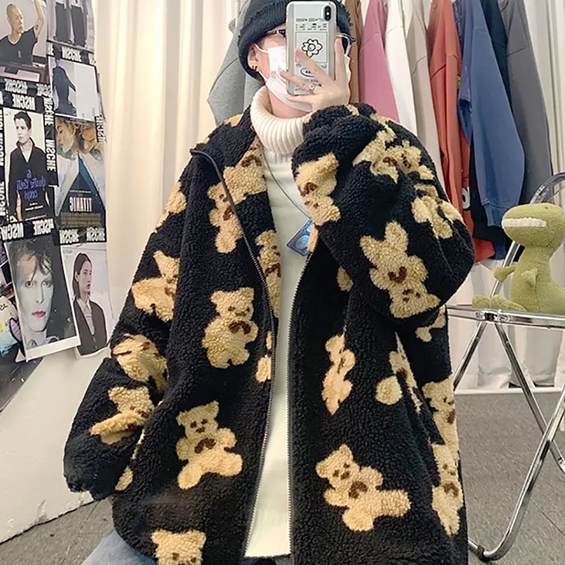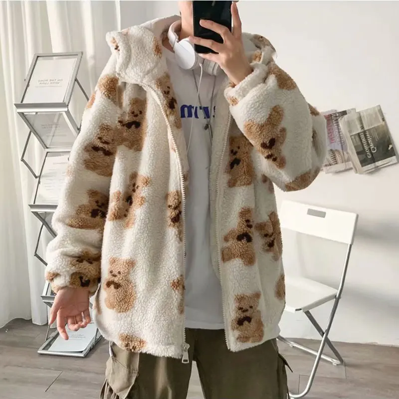 Флисовая Куртка с капюшоном в уличном стиле, Повседневная Уличная одежда в стиле Харадзюку, хип-хоп, мужская и женская модная куртка с капюшоном и принтом медведя, на молнии