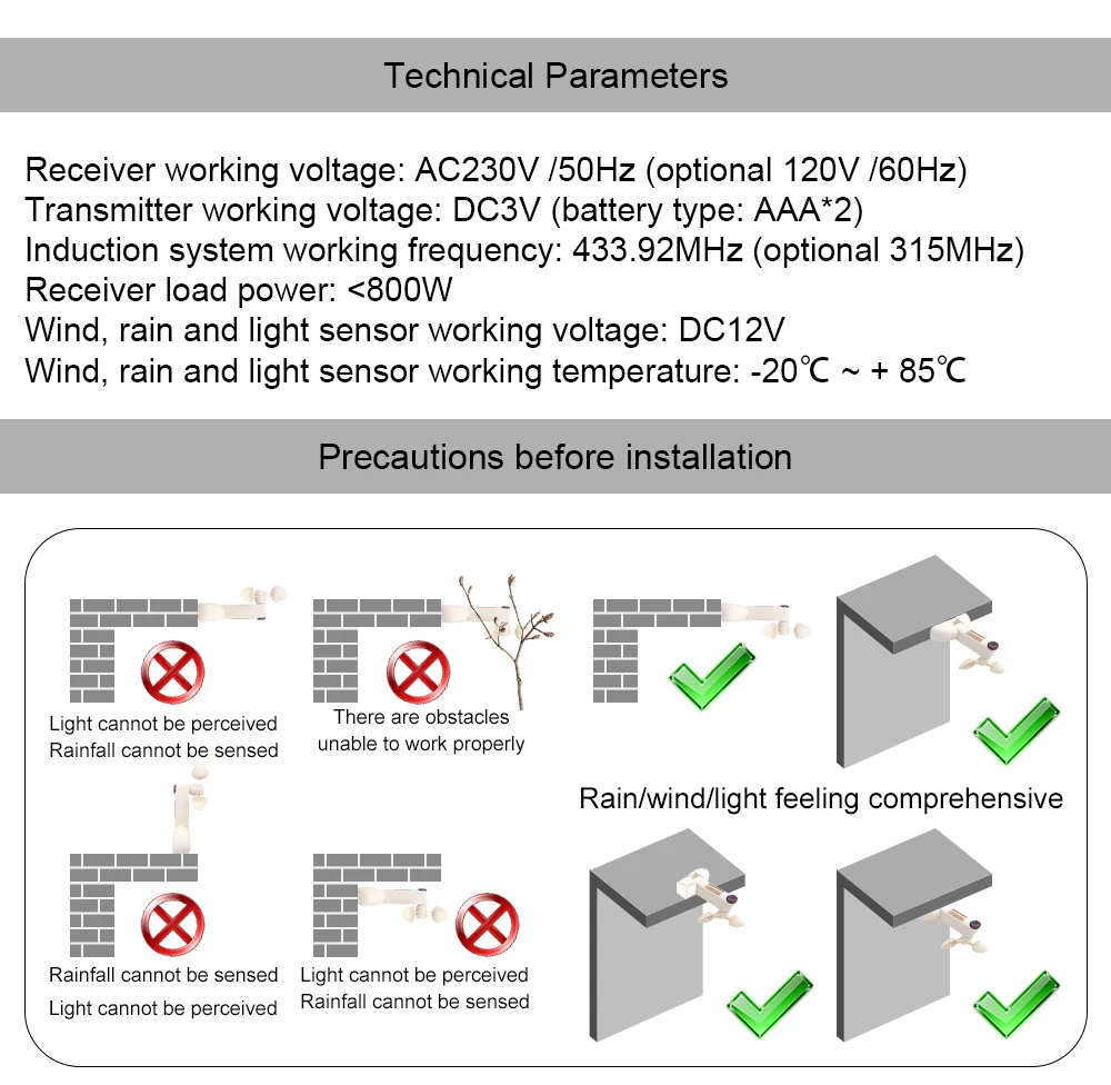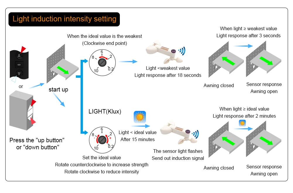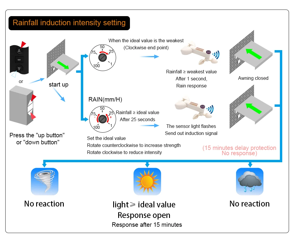 Программный режим датчикаЕсли ветер или дождь больше установленного значения, тент или жалюзи будут вытянуты или вытянуты. Предотвращает появление солнечных теней или жалюзи от ветра и дождя.Если светильник больше установленного значения, тент или жалюзи будут открываться или вытягиваться.