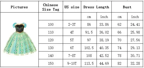 Размер CN: 100-110-120-130-140-150Возраст: От 2 до 3 лет, 4T,5T,6T, От 7 до 8 лет, От 9 до 10 летМатериал: полиэстер, сеткаАксессуары: перчатки, палочка, парик, корона, ожерелье, пожалуйста, выберите то, что вам нужноПарик: свободный размер, лучше для девочек 4T или большеПринцесса: Анна