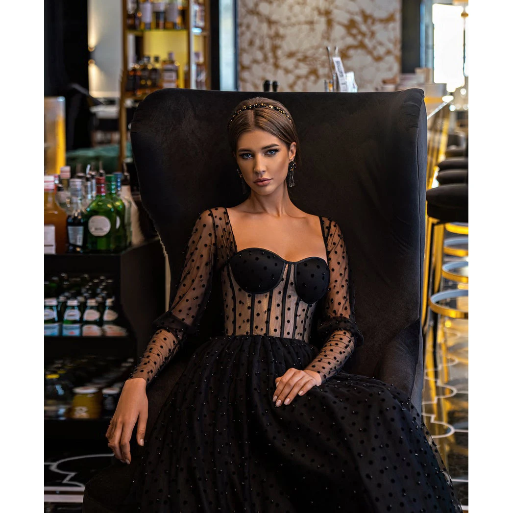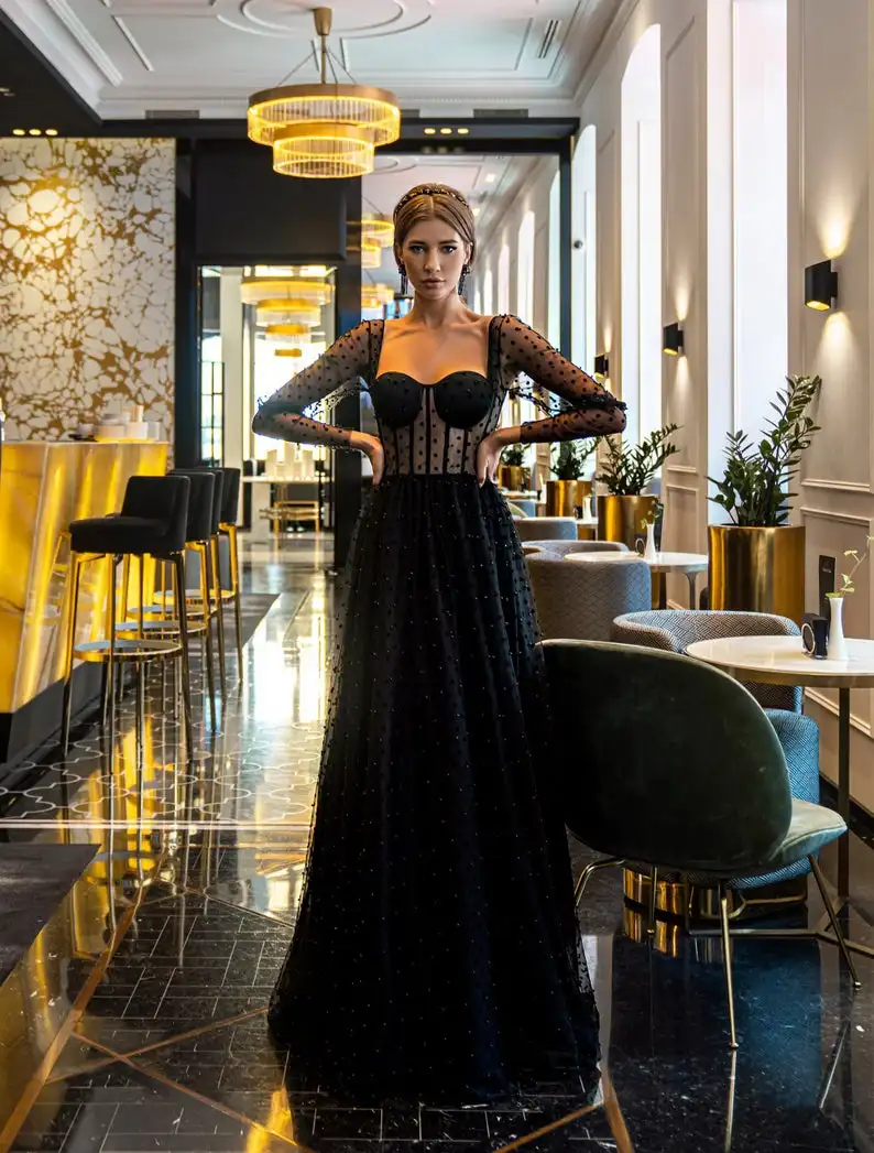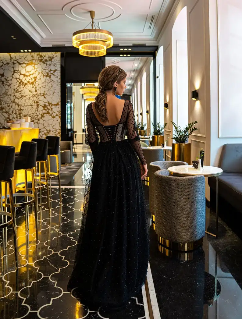Черные элегантные платья для выпускного вечера 2021 с длинным рукавом без бретелек из фатина трапециевидного силуэта женские красивые Формальные Вечерние платья для выпускного вечера