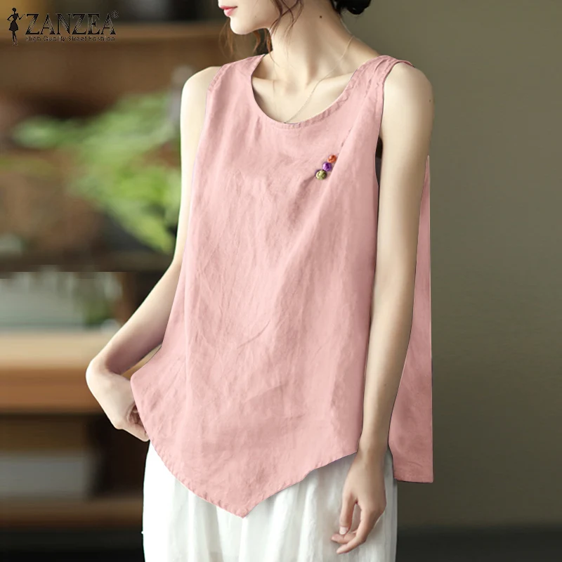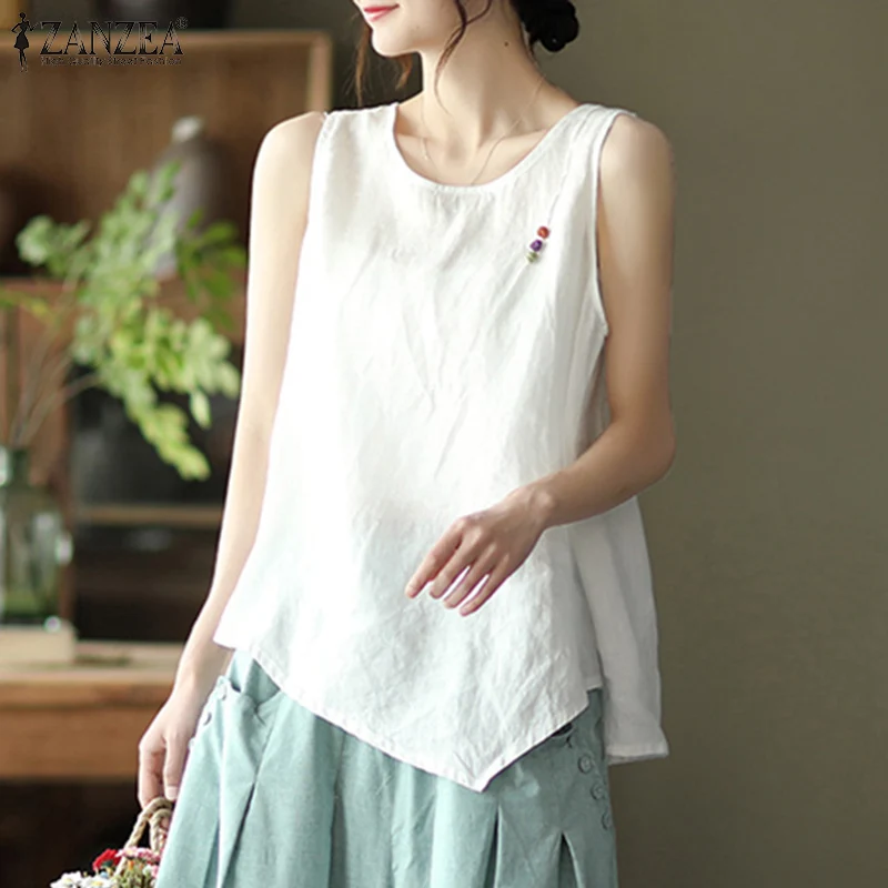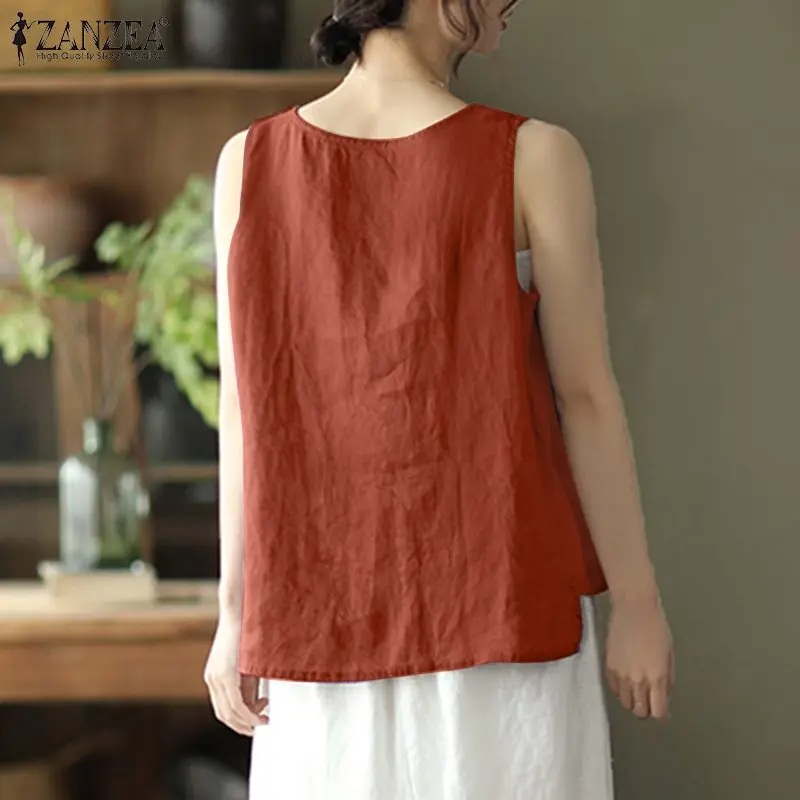 Блузка ZANZEA женская с круглым вырезом, винтажная Туника без рукавов, однотонная хлопковая рубашка, Повседневная Свободная одежда, большие размеры, на лето