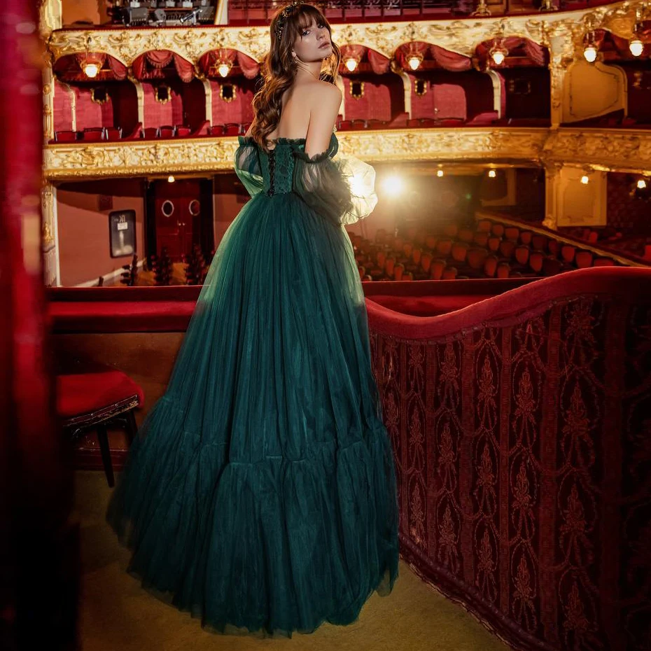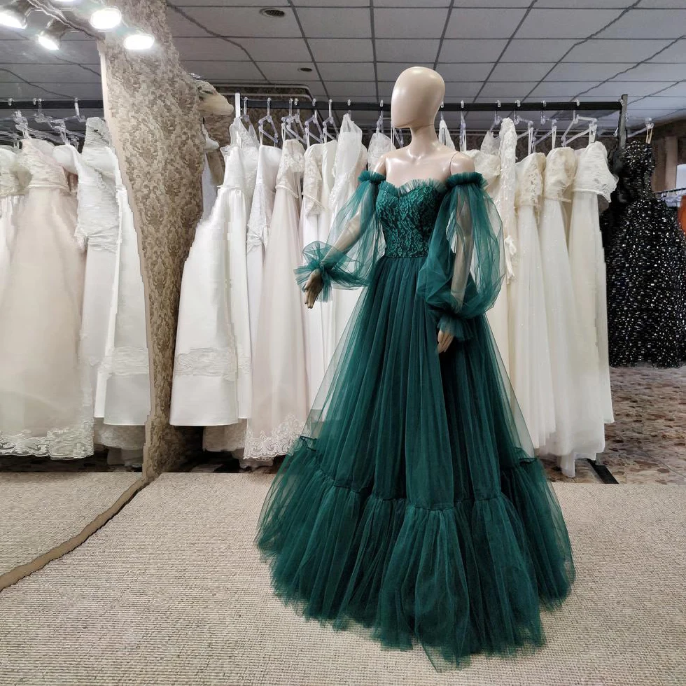 Женское бальное платье с длинным рукавом, открытыми плечами и кружевной аппликацией