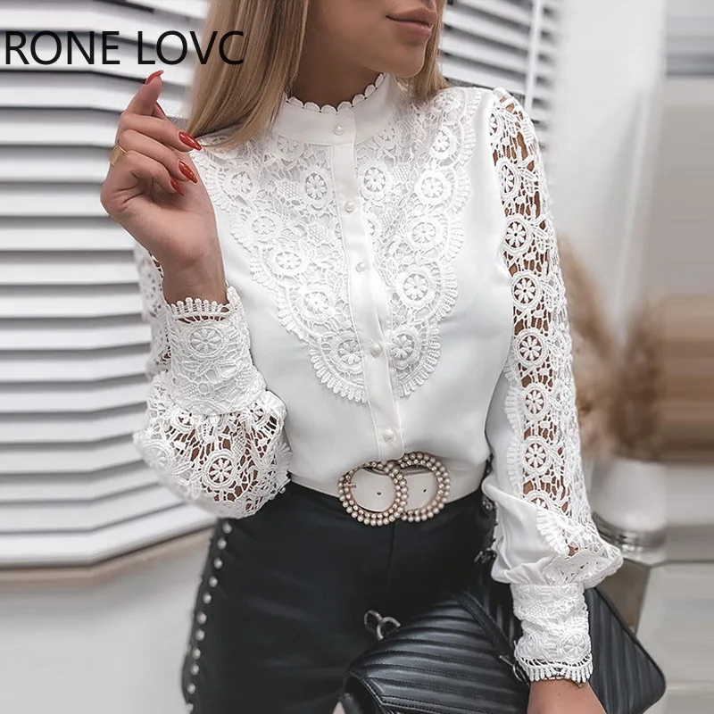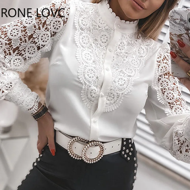 Женская кружевная блузка с рукавами-лепестками и воротником-стойкой