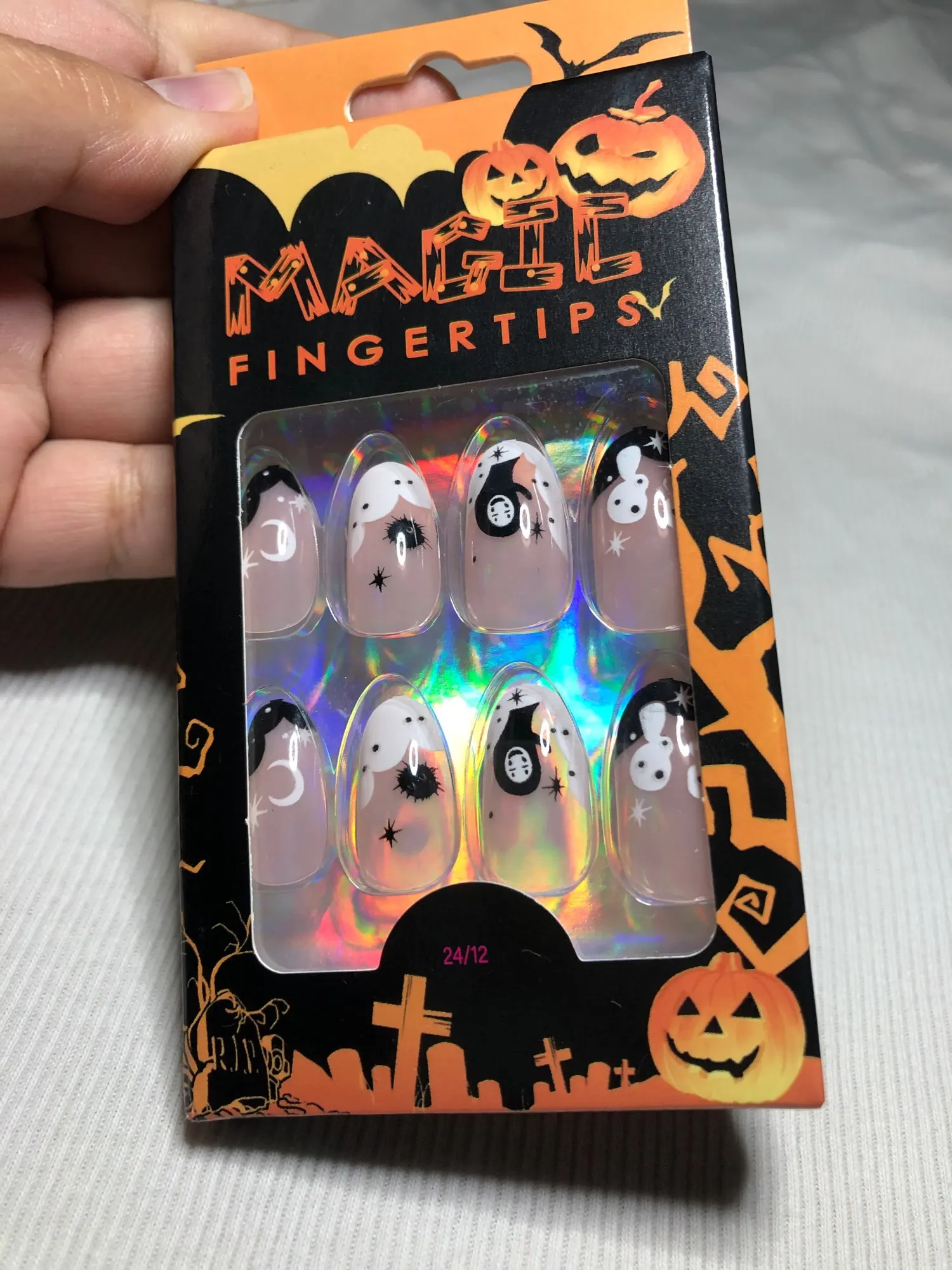 Накладные ногти, миндаль, для Хэллоуина, черный призрак, искусственные ногти, тыквенный замок, узор, глянцевые 24 шт.компл., Модные накладные ногти