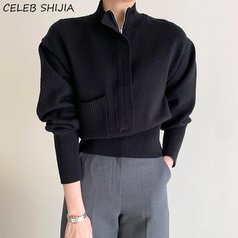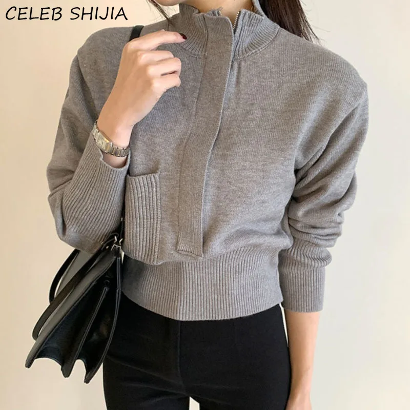 Свитер женский трикотажный, с воротником-стойкой и длинным рукавом, на осень