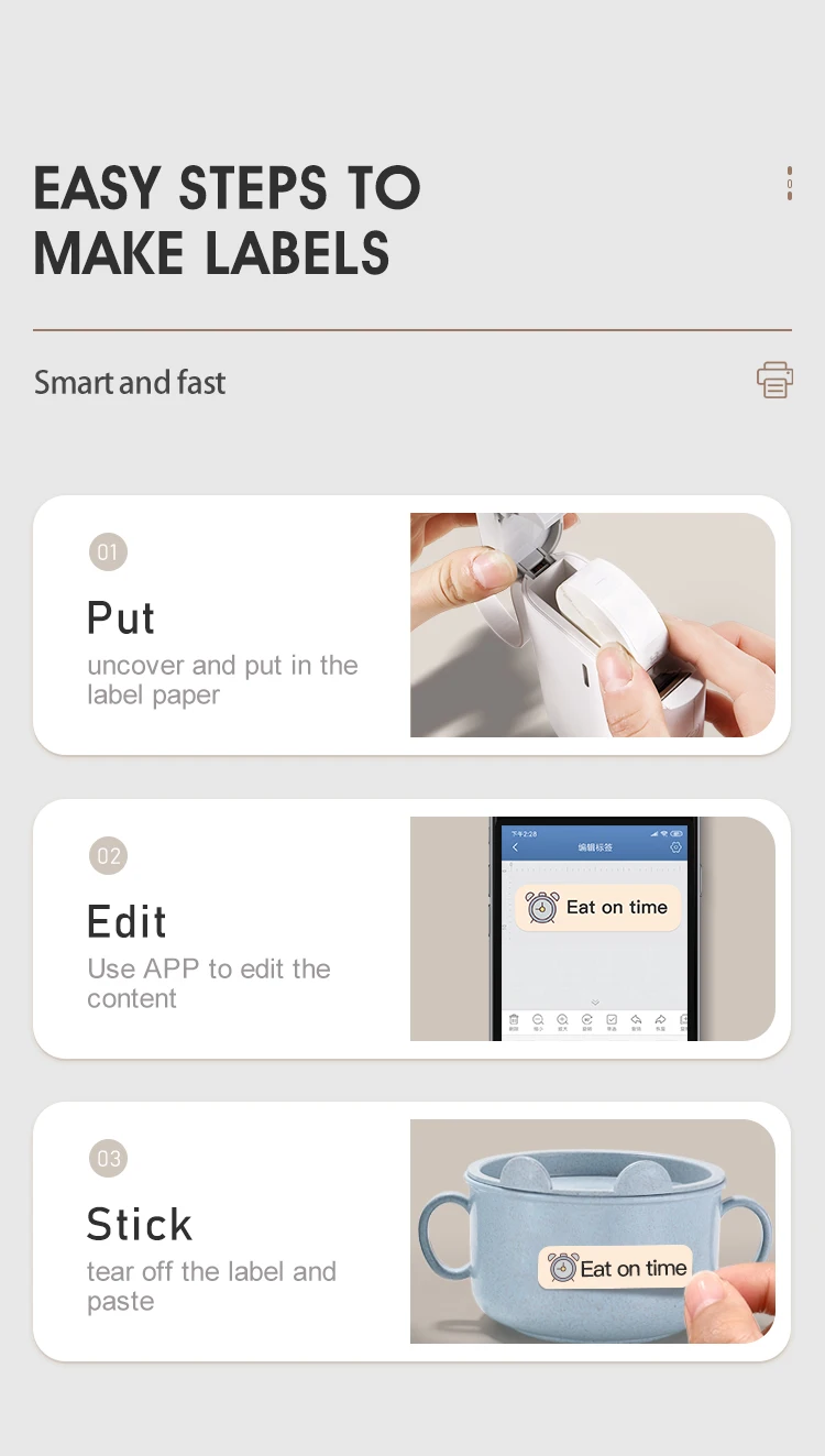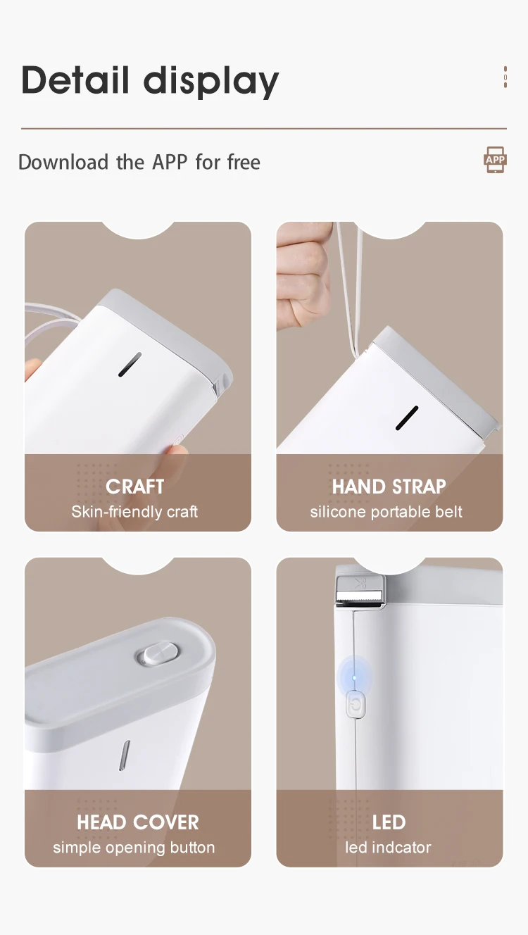 1. Прямой термический, без чернил, тонера или лент.2. Половина веса и размер традиционной этикетки!3. Встроенная аккумуляторная батарея!4. Больше никаких головокружений и трудно нажимать на мини-клавиатуру!5. Увеличение DPI на 25%, более четкое!6. Больше материалов для печати этикеток, символов, графики, QR-кодов и т. д.!7. Может распознавать изображения и языки и преобразовывать их в ярлыки!