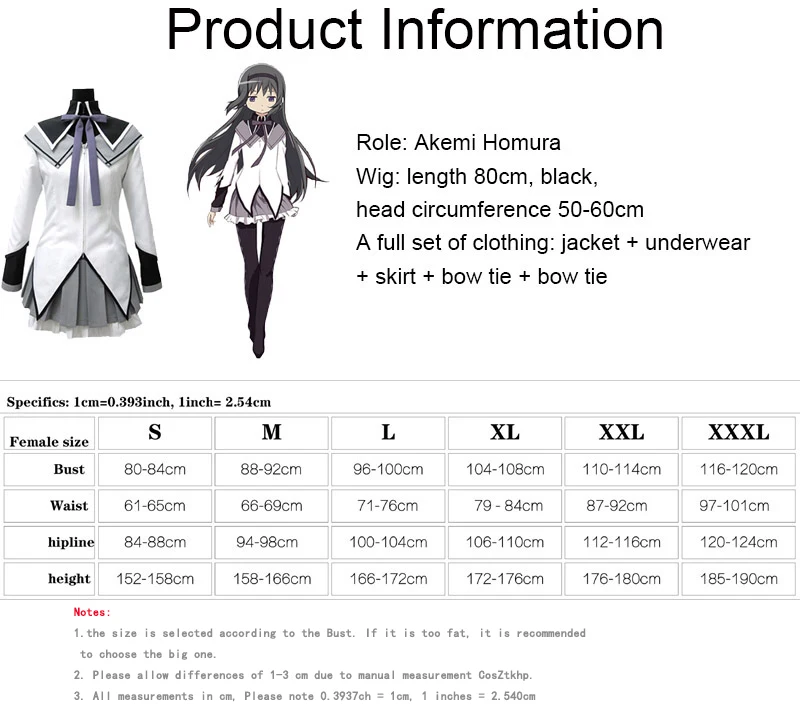 Роль: Akemi HomuraПарик: длина 80 см, черный, окружность головы 50-60 смПолный комплект одежды: куртка + нижнее белье + юбка + галстук-бабочкаЧулки: пользовательские стили чулок необходимо приобретать отдельно, спасибо за понимание.