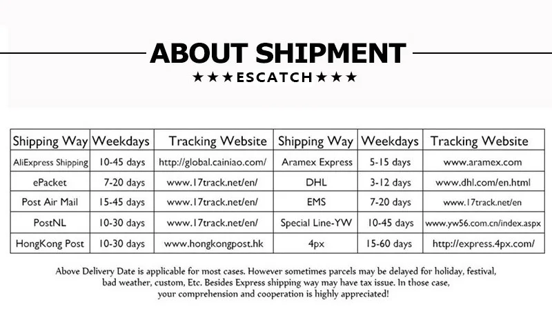 1. Можете ли вы осуществлять оптовую и прямую доставку?В случае оптовой закупки мы предлагаем скидку или бесплатную экспресс-доставку. Ее срок составляет всего 3–7 дней.По запросу мы можем посылать товары напрямую вашим клиентам, не предоставляя информацию о себе (дропшиппинг). 2. Как отследить посылку?Вы можете отследить свою посылку на следующем веб-сайте с помощью вашего номера отслеживания: 17 треков (скопированы в браузер для поиска) 3. Что я могу сделать, когда время защиты покупки истекает?Если срок защиты заказа истекает, свяжитесь с нами, и мы поможем его продлить. Так что ваши деньги не поступят на мой счет. 4. Есть ли таможенный налог?Из-за различных политик в разных странах, может быть таможенный налог, который должен быть оплачен покупателем.5. Больше вопросов о заказе, пожалуйста, свяжитесь с нами.