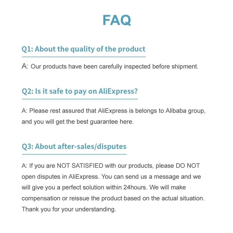 3. Негативные или нейтральные отзывы не помогут решить проблему. Если у Вас возникли какие-либо проблемы при получении посылки, пожалуйста, сначала свяжитесь с нами, а не оставьте негативные отзывы, спасибо. Мы должны предоставить вам удовлетворительное решение.
