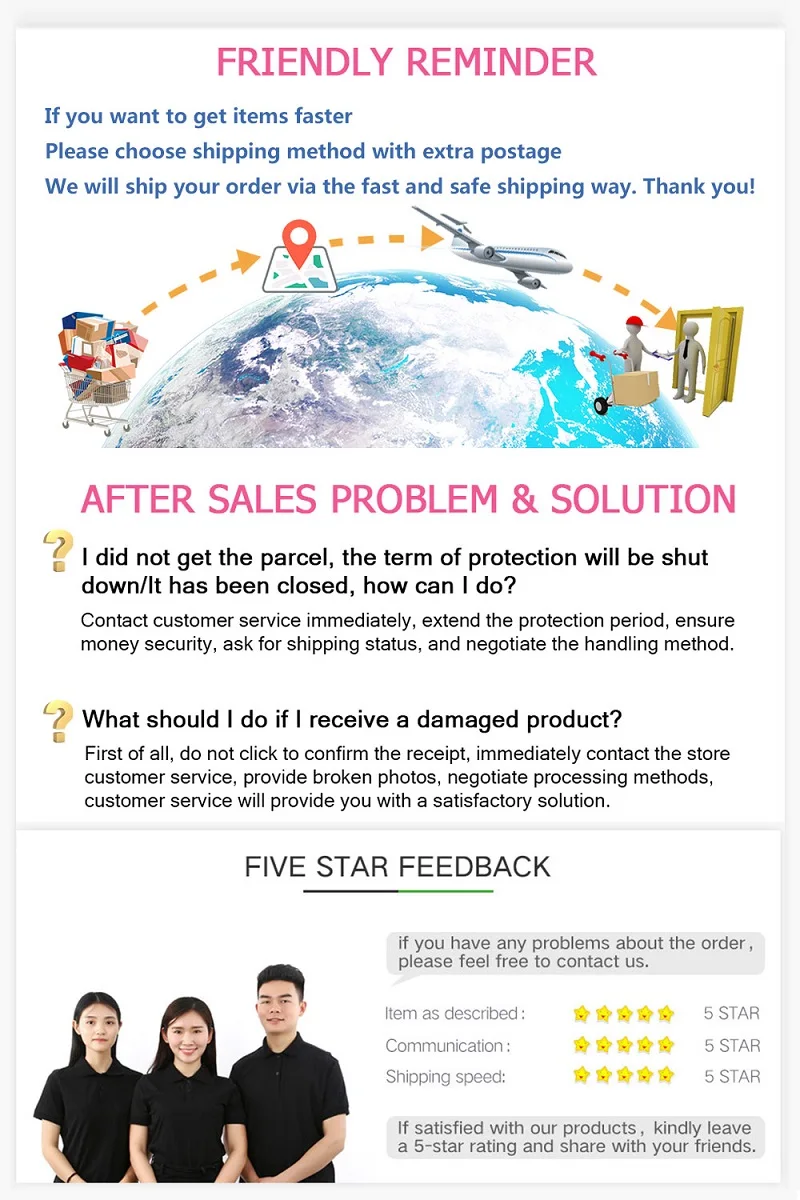Мы расцениваем клиентов как наших друзей. Мы надеемся, что вы сможете купить у нас больше счастья и меньше беспокойства. Ваша поддержка очень важен для нас, пожалуйста, не забудьте оставить нам отзыв (5 звезд).