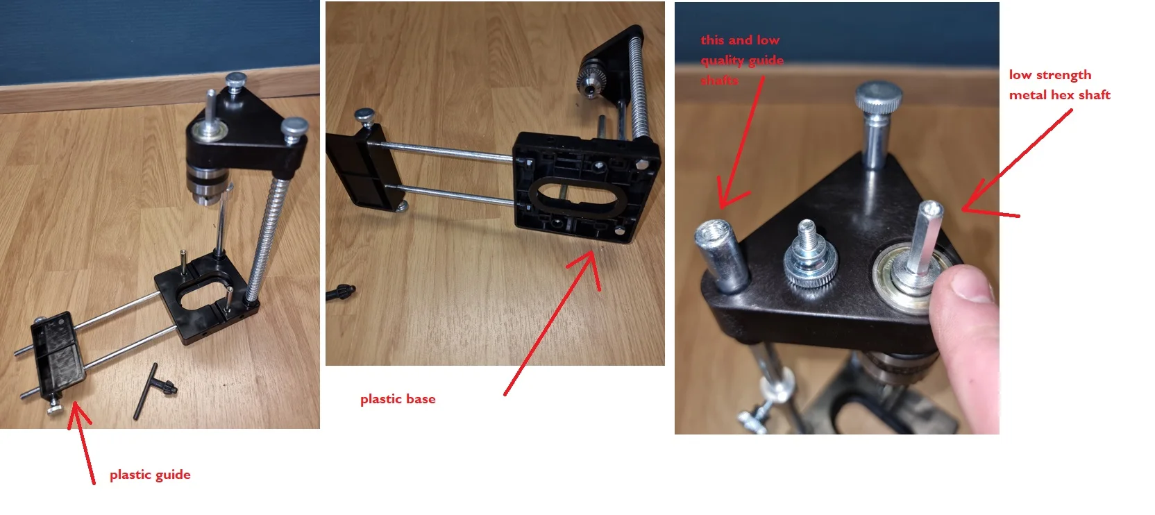 Никогда не пытайтесь купить его! Трата денег! Вместо сплава, бесполезная пластиковая чушь. Не Достаточно жесткая, как должно быть, и голова скорее прыгает, чем движется гладко. Вы никогда не сможете просверлить достаточно точное отверстие. Лучше использовать yuor вручную. Наконец, он попадает в мусорное ведро. Заявлено о полном возврате, получил 1/3. Хотел, чтобы я отправил его обратно по своей цене, которая превышает цену этого дерьма. Aliexpress не поможет во время споров. Кроме того, вы ничего не можете оставить комментарий, можете только договориться или не согласны. Продавец ошибся. Жалкое заявление о явном обмане.