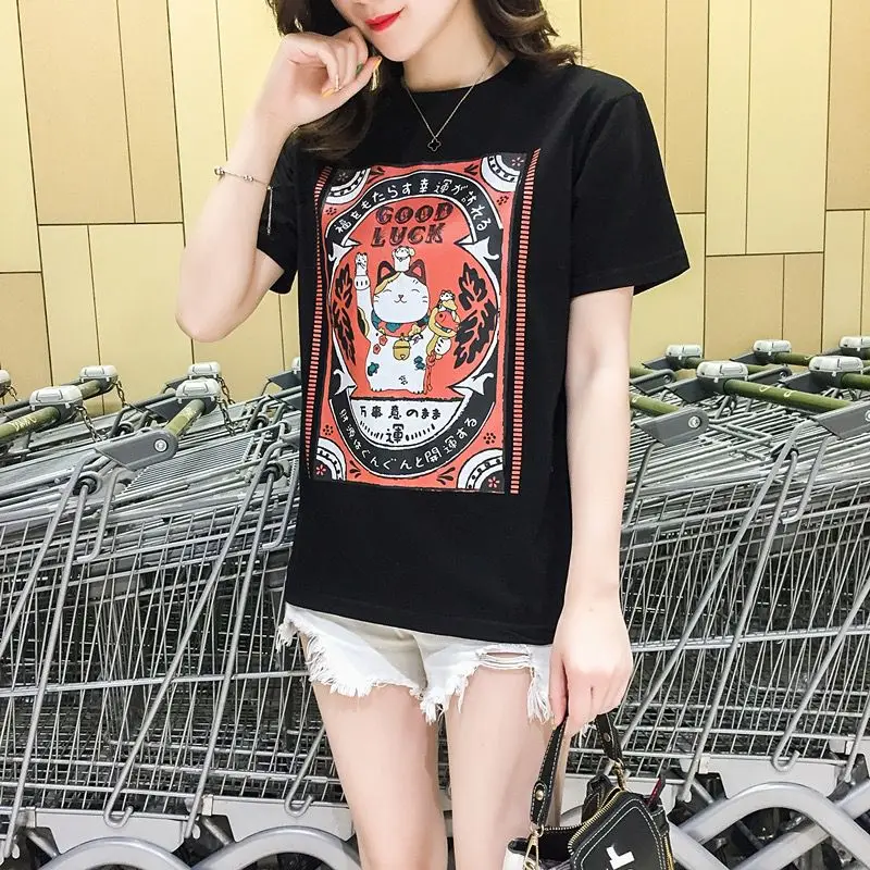 Хлопковые Топы И Футболки dreamchenbay-jf, модная летняя одежда для девочек с мультяшным рисунком, с круглым вырезом и коротким рукавом, одежда для удачи с котом