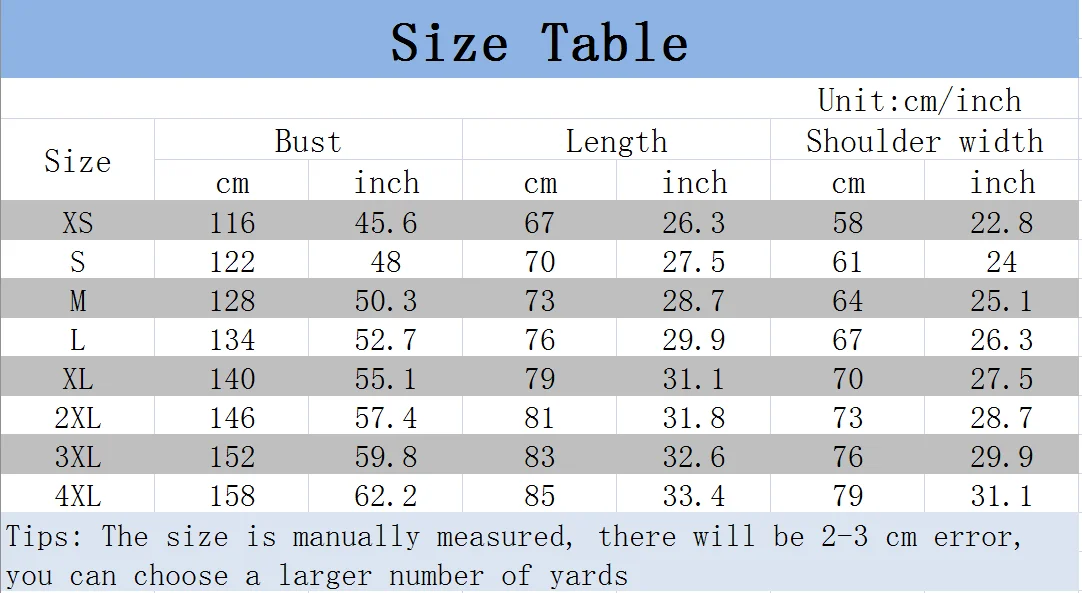 Все используемые нами размеры были измерены лично.Таблица размеров только для справки.При размещении заказа, пожалуйста, оставьте сообщение с вашим весом (кг/фунт) и ростом (см/дюйм). Мы с радостью поможем вам выбрать правильный размер. Рекомендуется выбирать размер 1-2. Если вы не знаете, как выбрать размер, вы можете связаться с нами в любое время. Из-за разных регионов и разного времени мы не можем ответить вам вовремя, но мы ответим вам в первый раз после просмотра новостей.