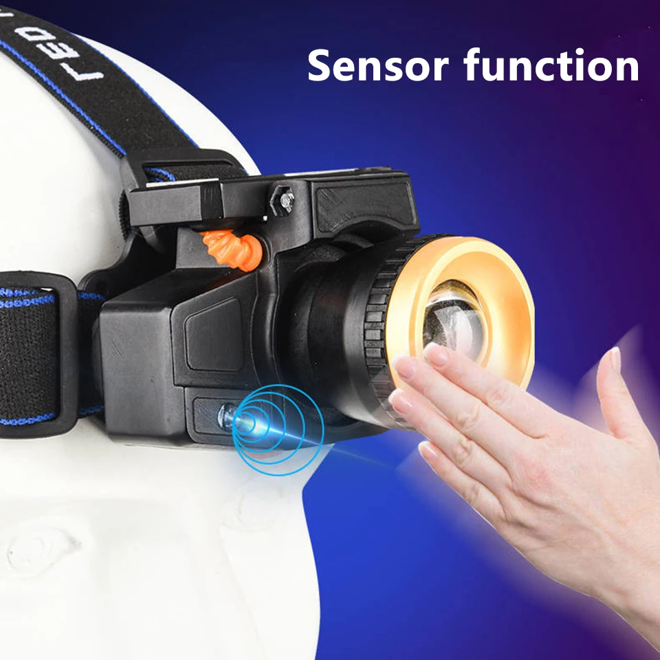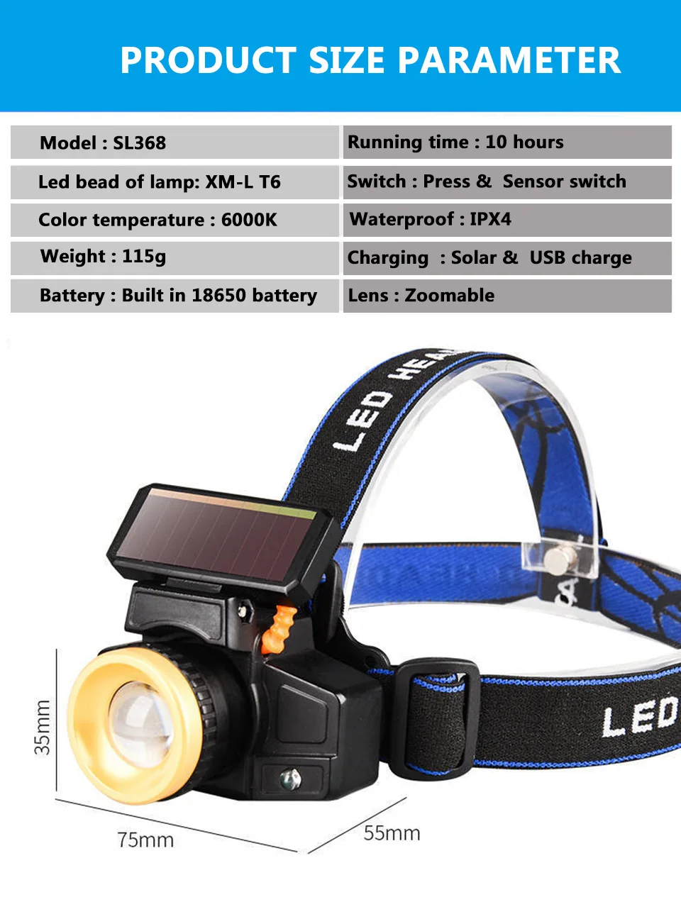 Светодиодный головной фонарь XM-L T6 с солнечным датчиком, встроенной батареей 18650, USB-зарядка, Головной фонарь с фокусировкой, водонепроницаемый светильник