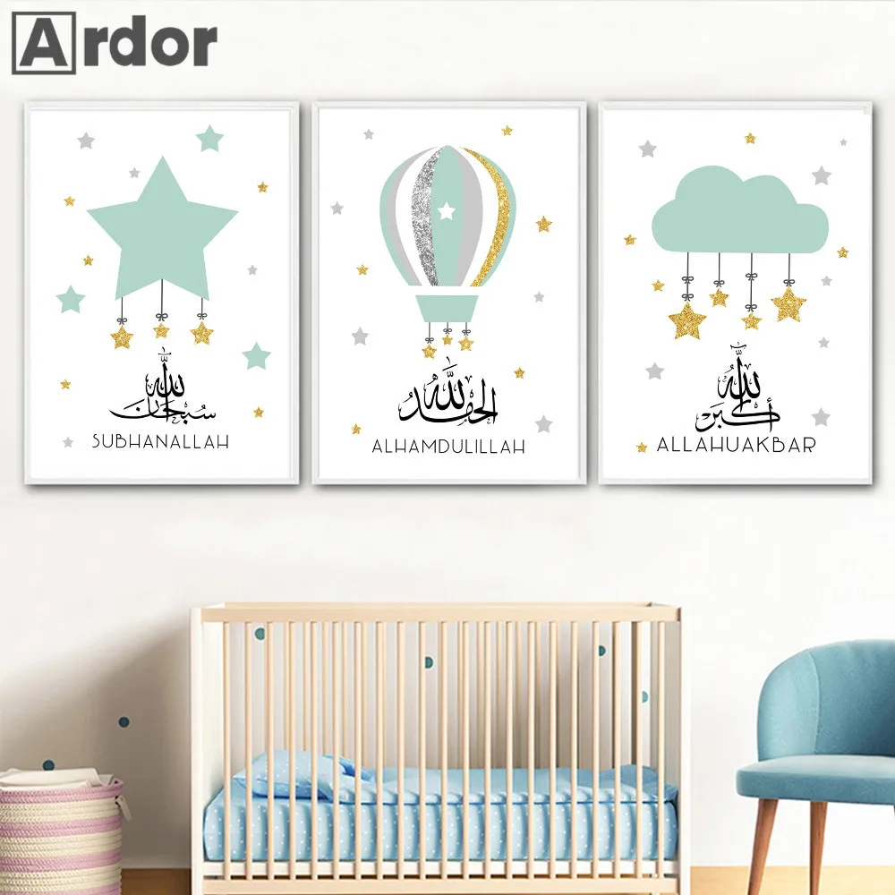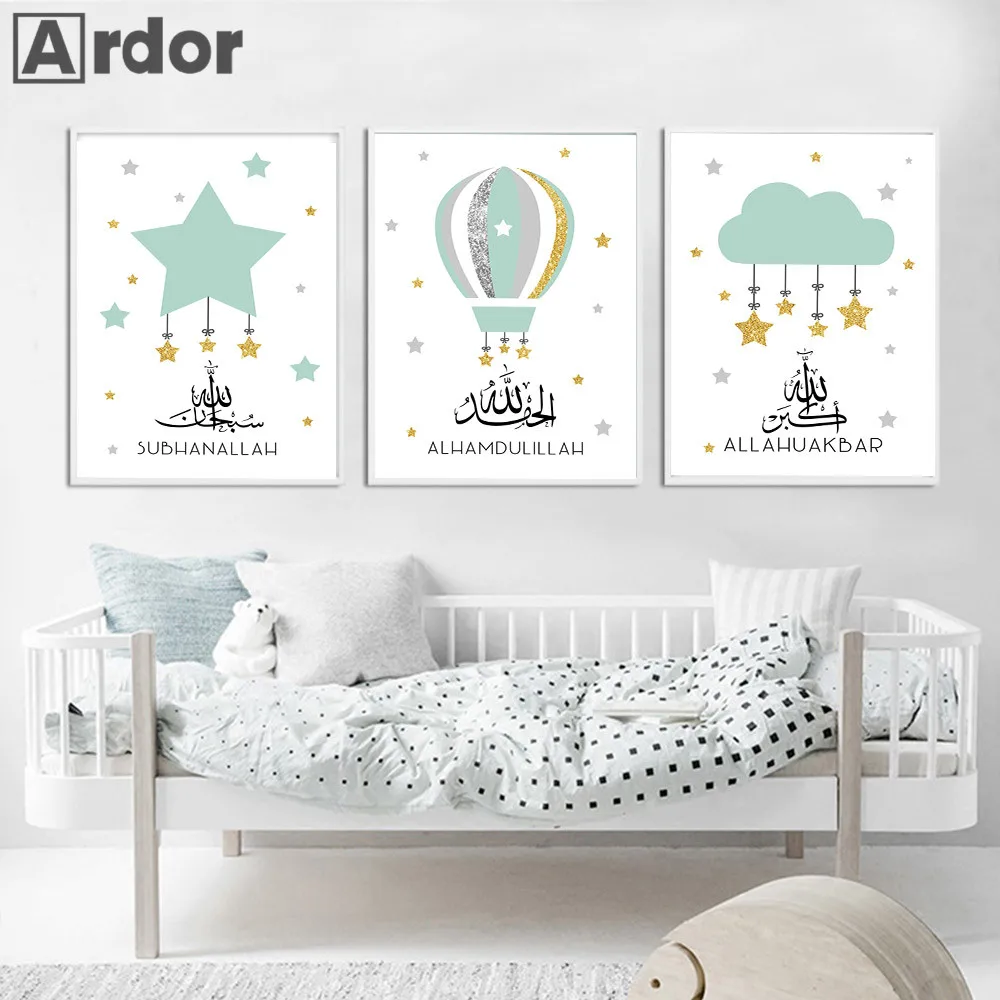 Исламские зеленые и золотые звезды, облако, Художественная печать, воздушный шар, детская Картина на холсте, детская Настенная картина, плакаты, картины, декор детской комнаты