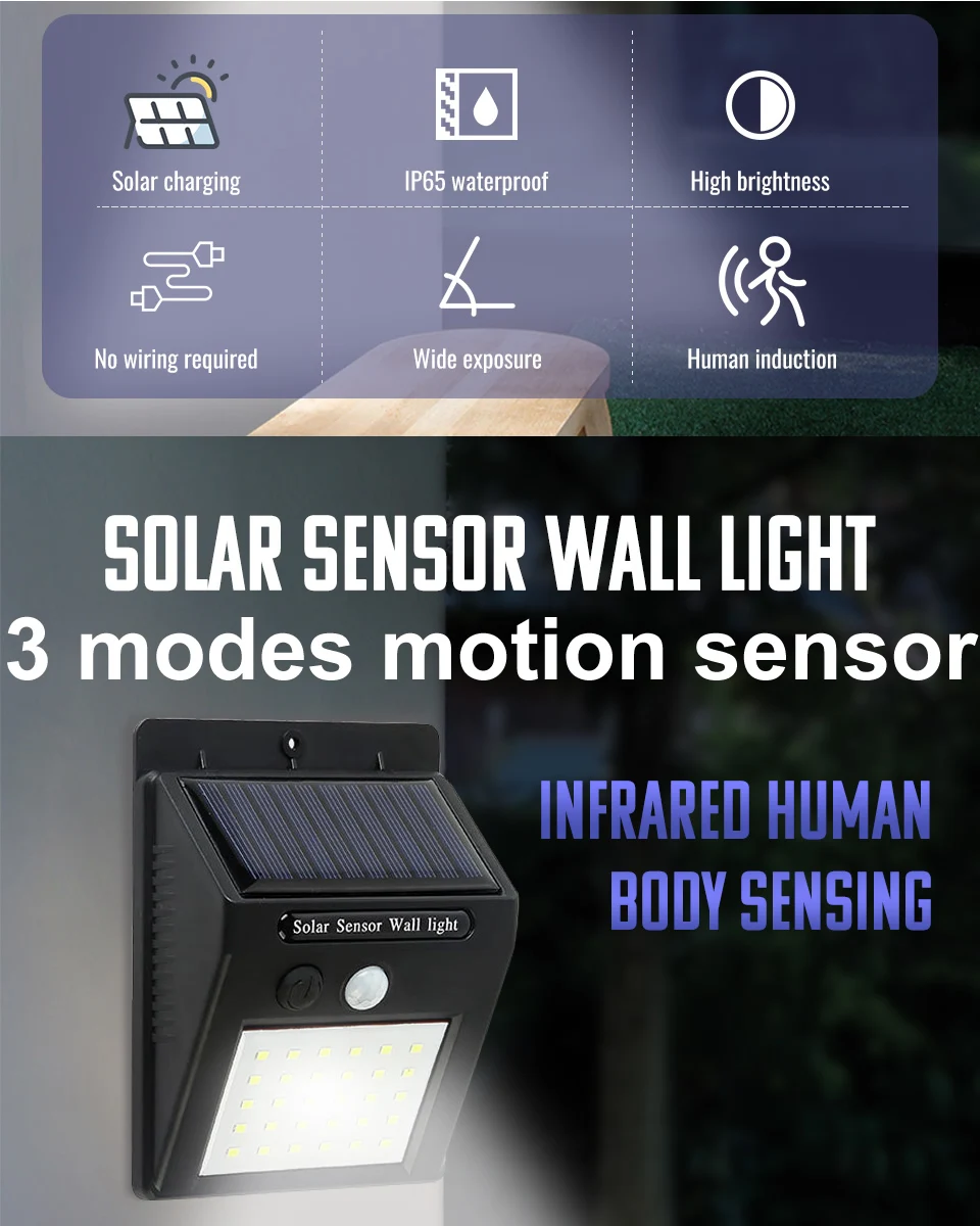 Вопрос: Почему солнечный светильник не может работать?Ответ: Пожалуйста, проверьте следующие элементы.1. Подтвердите включение или нет.2. Это сенсорный светильник, он не может работать в дневное время, он может работать только в темноте.3. Подтвердите, используется ли он непрерывно в долгосрочной перспективе и без зарядки, Перезарядите его своевременно, прежде чем использовать снова.4. Убедитесь, что люди двигаются в пределах диапазона wensing.5. Убедитесь, что светильник солнечного датчика установлен в пределах чувствительного диапазона.6. Подтвердите правильность направления установки (панель солнечных батарей должна быть обращена вверх).7. Подтвердите отсутствие объектов, блокирующих его, и солнечная панель может принимать солнечный свет.Особенности1. Хорошее качество: Использование высококачественного АБС-материала, он прочный для использования на открытом воздухе и длительного использования.2. Датчик движения PIR: чувствительный светильник датчика PIR может обнаруживать движение людей от 3 до 5 м. Светильник будет автоматически включаться и выключаться.3. Водонепроницаемость IP65: солнечный светильник изготовлен из АБС-пластика и водонепроницаемого материала IP65. Он может работать в различных видах погоды, таких как Дождь Снег ang туман.4. Долгие рабочие часы: если полностью зарядить аккумулятор более 8 часов с прямыми солнечными лучами, он будет держать освещение более 6-8 часов5. Питание от солнечной энергии: солнечная панель находится в верхней части лампы. Он автоматически хранит электричество в течение дня. Пожалуйста, установите продукт в месте прямого солнечного света. Этот уличный солнечный светильник беспроводной. Вы можете установить его на стену6. Супер яркий: намного ярче, чем другие лампы. Каждый светильник на солнечной энергии имеет превосходно-яркий защитный глаз, без мерцания и без излучения белый светодиодный светильник s для освещения. Легко установить на дерево стекло металл.Примечание1. Пожалуйста, убедитесь, что солнечный светильник установлен в пределах 3 м высоты и убедитесь, что солнечная панель может поглощать солнечный светильник. Перед использованием Включите переключатель.2. Следующая среда не подходит для установки.* Стекло (несмотря на то, что есть защита от солнца светильник, Стекло блокируется, который влияет на светильник интенсивностью. Это влияет на зарядку аккумулятора)* Зона наблюдения (не подходит для установки в районе, где осуществляется мониторинг. Мониторинг имеет инфракрасные лучи. Это повлияет на яркость лампы)* Под карнизом плитки (без карниза плитки, деревьев, проводов и других препятствий над областью, где установлены лампы)* Светильник время поджимает (область Солнечная лампа устанавливается должны подвергаться воздействию солнца светильник в течение по крайней мере 6 часов)