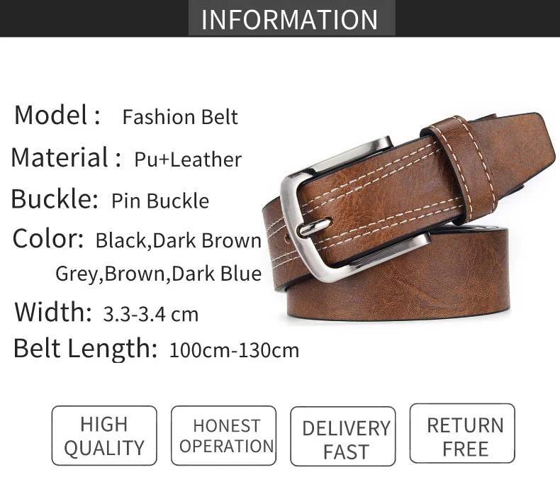 Подробная информация о ремне: Наименование ремня: мужской повседневный ремень Дизайн пряжки: Пряжка Цвет ремня: черный; Коричневый; Темно-коричневый; Серый; Темно-синий Стиль: имиджевый, официальный, новинка, кэжуал, деловой Длина ремня: от 95 до 130 см (не обхват талии) Пожалуйста, выбирайте размер правильно Пояс можно регулировать в зависимости от размеров вашей талии.