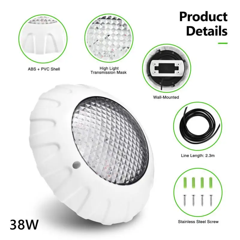Подводный светильник для бассейна изготовлен из превосходного поликарбоната, полностью погружной, устойчивый к коррозии и высоким температурам. Водонепроницаемый IP68 с эпоксидным наполнением внутри, чтобы сделать его водонепроницаемым, гарантирует, что его можно использовать под водой в течение длительного времени без повреждений