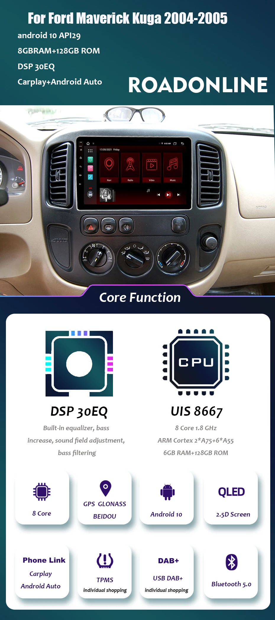 Автомагнитола Roadonline, медиаплеер для Ford Maverick Kuga 2004-2005, Gps-навигация, Bluetooth, Android 10, склад в ЕС, в Европе