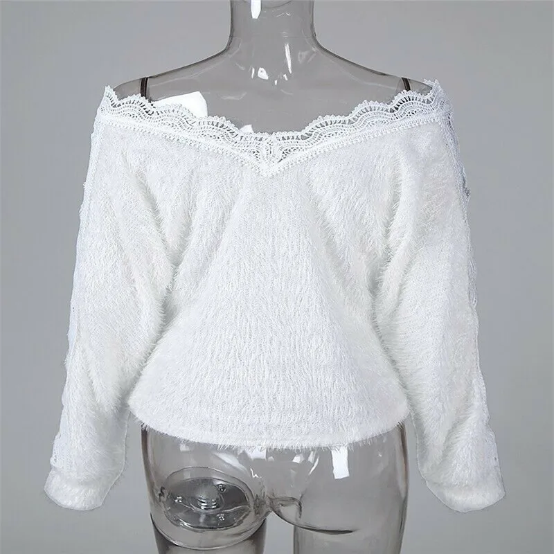 Женские свитера с открытыми плечами, кружевные топы с V-образным вырезом, Женский Повседневный свободный свитер, теплый осенне-зимний пуловер