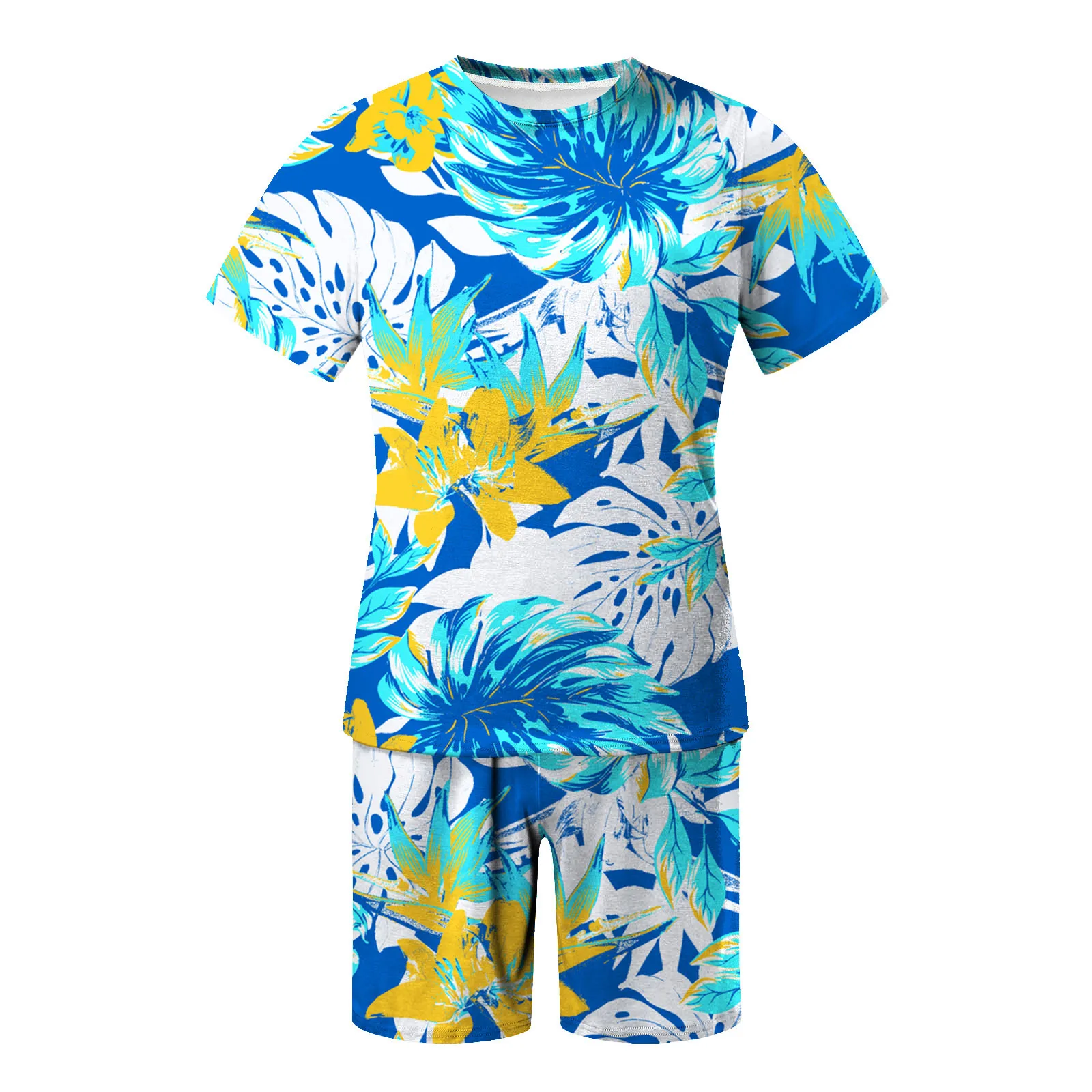 Мужские комплекты, летний трендовый уличный Модный повседневный пляжный костюм с шортами с принтом листьев, футболка с коротким рукавом, комплект из 2 предметов, спортивная одежда