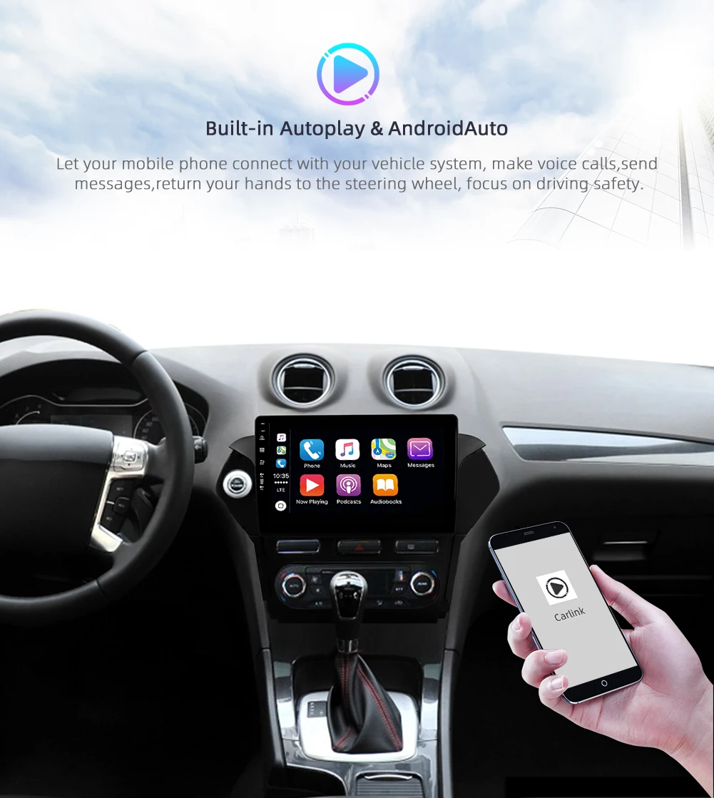 ● Встроенный Android Auto & Apple CarPlay, принимает вещи, которые вы хотите сделать с вашим телефоном во время вождения, и кладет их на встроенный дисплей вашего автомобиля. Вы можете получать указания, совершать звонки, отправлять и получать сообщения, а также слушать музыку, таким образом, чтобы вы могли оставаться сосредоточенными на дороге. Просто подключите телефон и перейдите. Вы также можете использовать управление рулевым колесом.