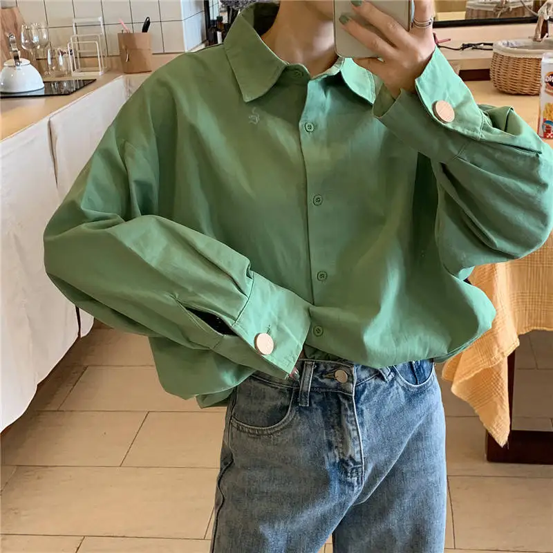 Женская рубашка с длинным рукавом HOUZHOU, белая винтажная уличная одежда большого размера в Корейском стиле, зеленый топ в стиле Харадзюку, Повседневная шикарная блузка для женщин
