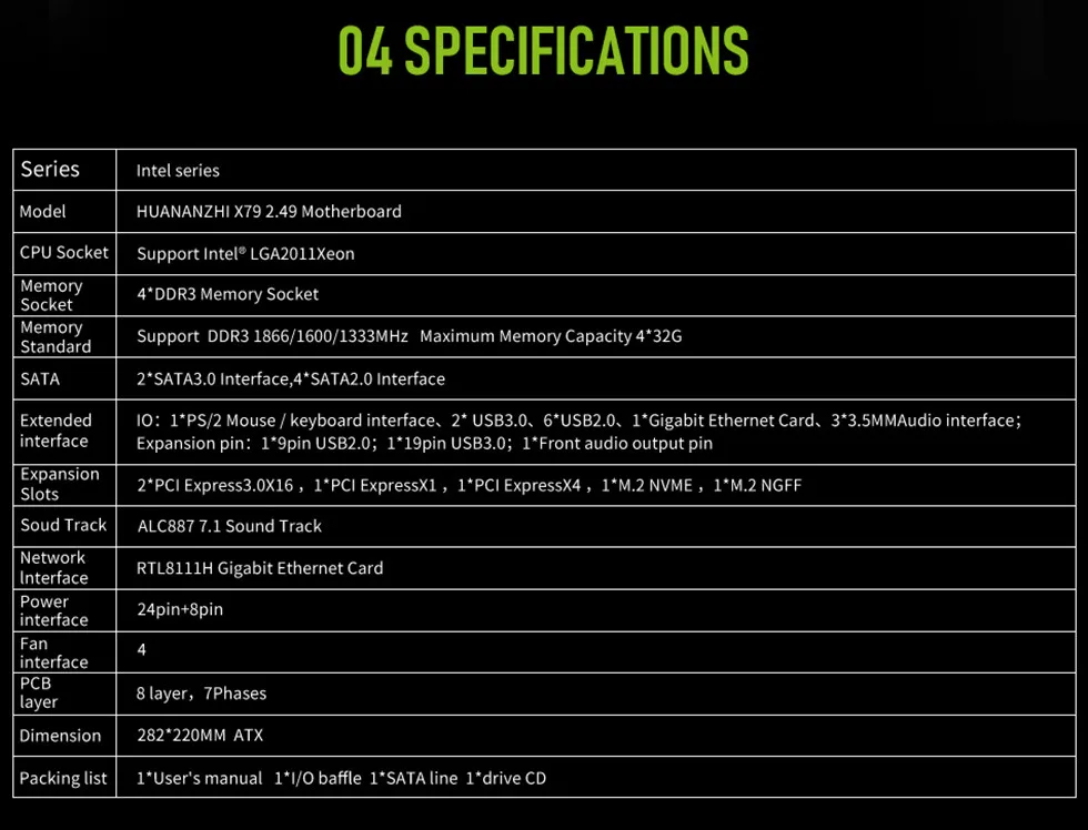 Модель: HUANANZHI Тип товара: зеленая материнская плата X79 Тип материнской платы: ATX Слот для видеокарты: 2 * PCI-E 3,0 16X 1 * PCI-E3.0 1X 1 * PCI-E3.0 4X Встроенная Видеокарта: нет Источник питания: 7 источников питания Слои печатной платы: 8 Ethernet: гигабитный Тип ЦПУ: LGA2011 (XEON E5 2620/2630/2640/2650/2660/2665/2670/2680/2690 C2 и V2) Слот памяти: 4 * DDR3(4 канала) Максимальный объем памяти: 32x4 DDR3 Скорость памяти: 1866/1600/1333 Поддерживаемый Тип памяти: non-ecc/reg ecc/ecc Интерфейс SATA: SATA3.0x2 SATA2.0x4 Интерфейс USB: USB3.0x4 USB2.0x10 (включая расширение) Интерфейс M.2: M.2 NVME + M.2 NGFF Аудиопорт: ALC887 7,1 каналов Размер: 282x220 мм Количество: 1 шт.