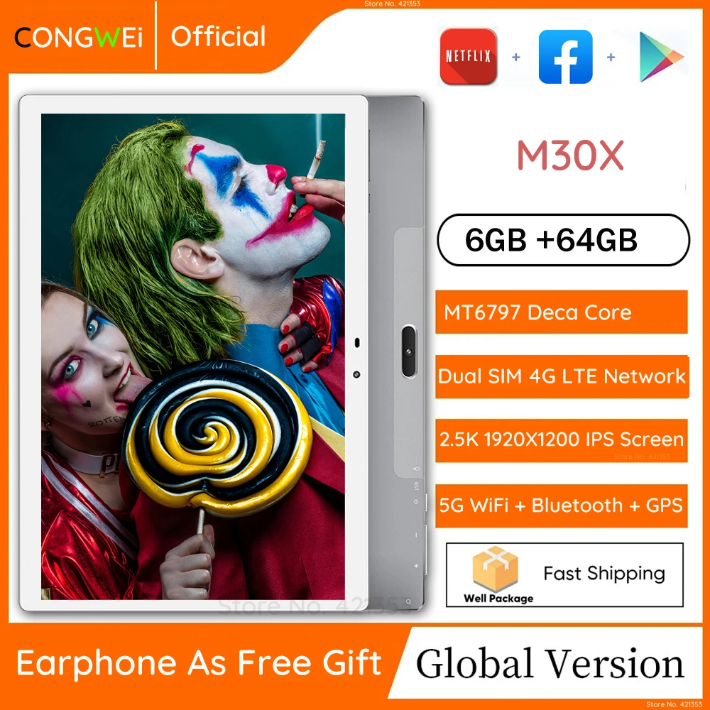 Планшет M30X Tab 10, экран 10,1 дюйма, 6 ГБ ОЗУ 64 Гб ПЗУ, Android, десятиядерный процессор, 1920x1200 IPS, 8000 мАч, 4G LTE, две SIM-карты, стандарт Wi-Fi